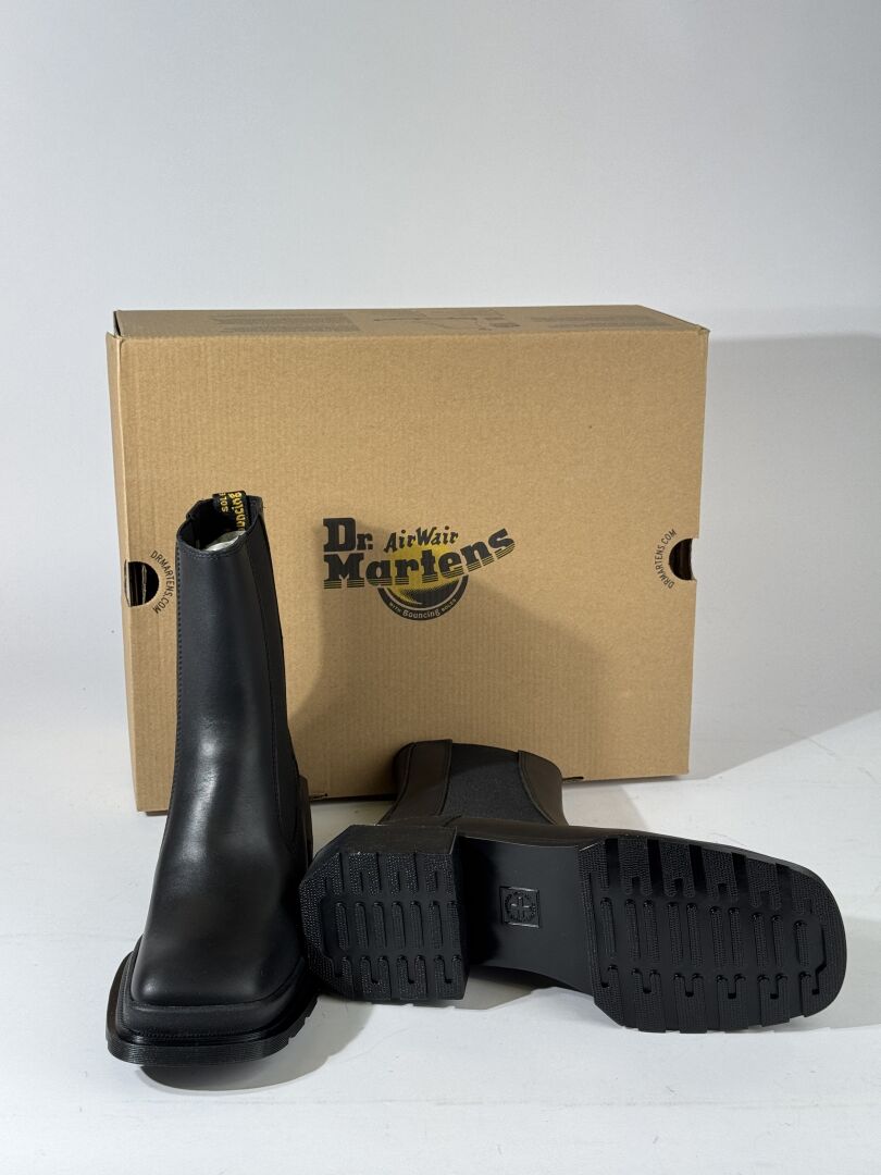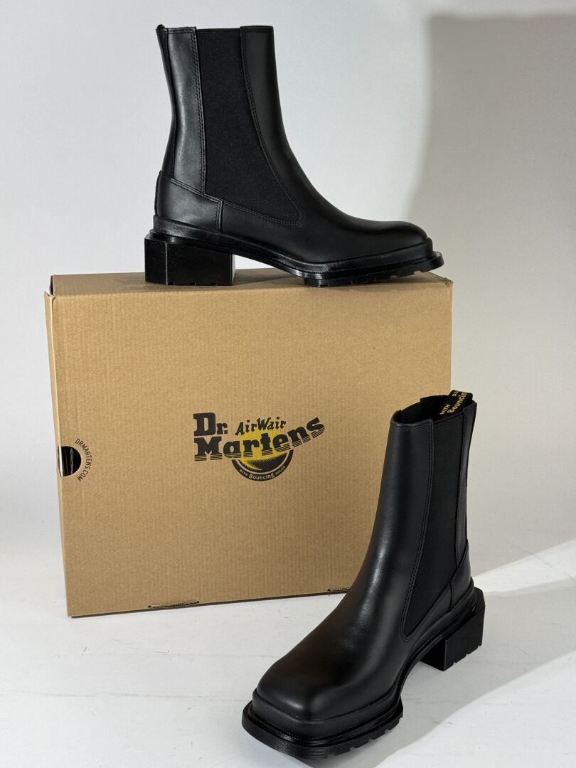 DR MARTENS - Paire de bottines modèle "Maybole Chelsea" en cuir noir, petit talon. Boite. Pointure 40 - Haut. Du talon : 4 cm Etat magasin