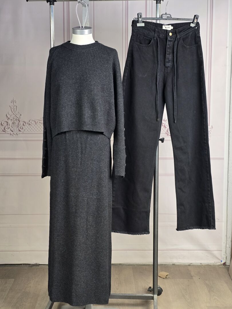 SAAJ - Lot comprenant un jean denim noir (taille 40) et un ensemble en mailles grises jupe (taille indiquée M/L) et pull manches longues (taille indiquée XS/S). Etat magasin