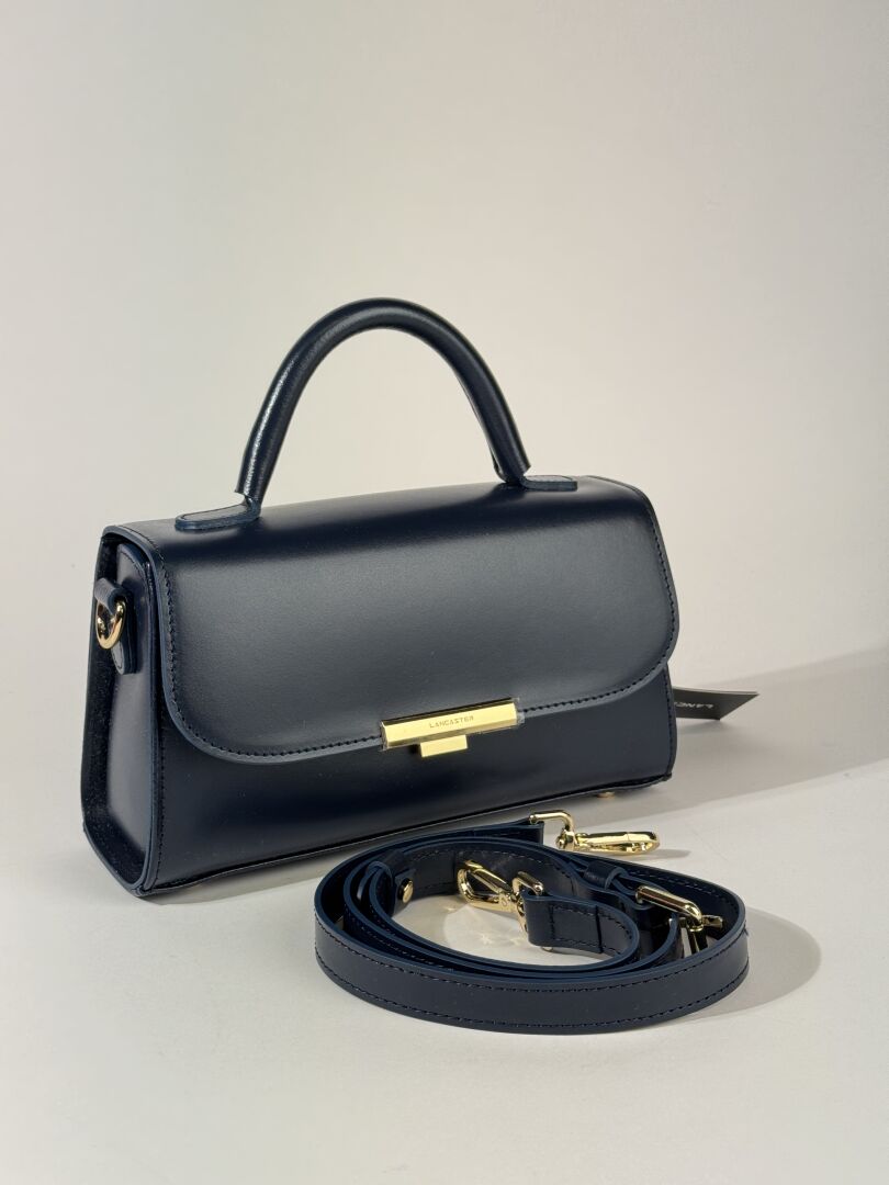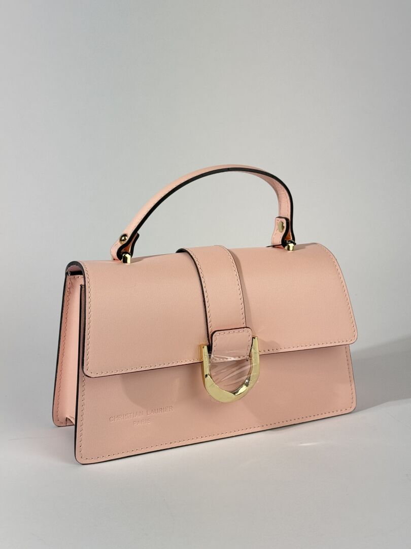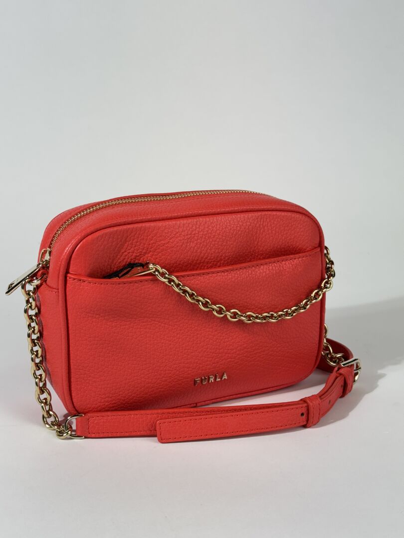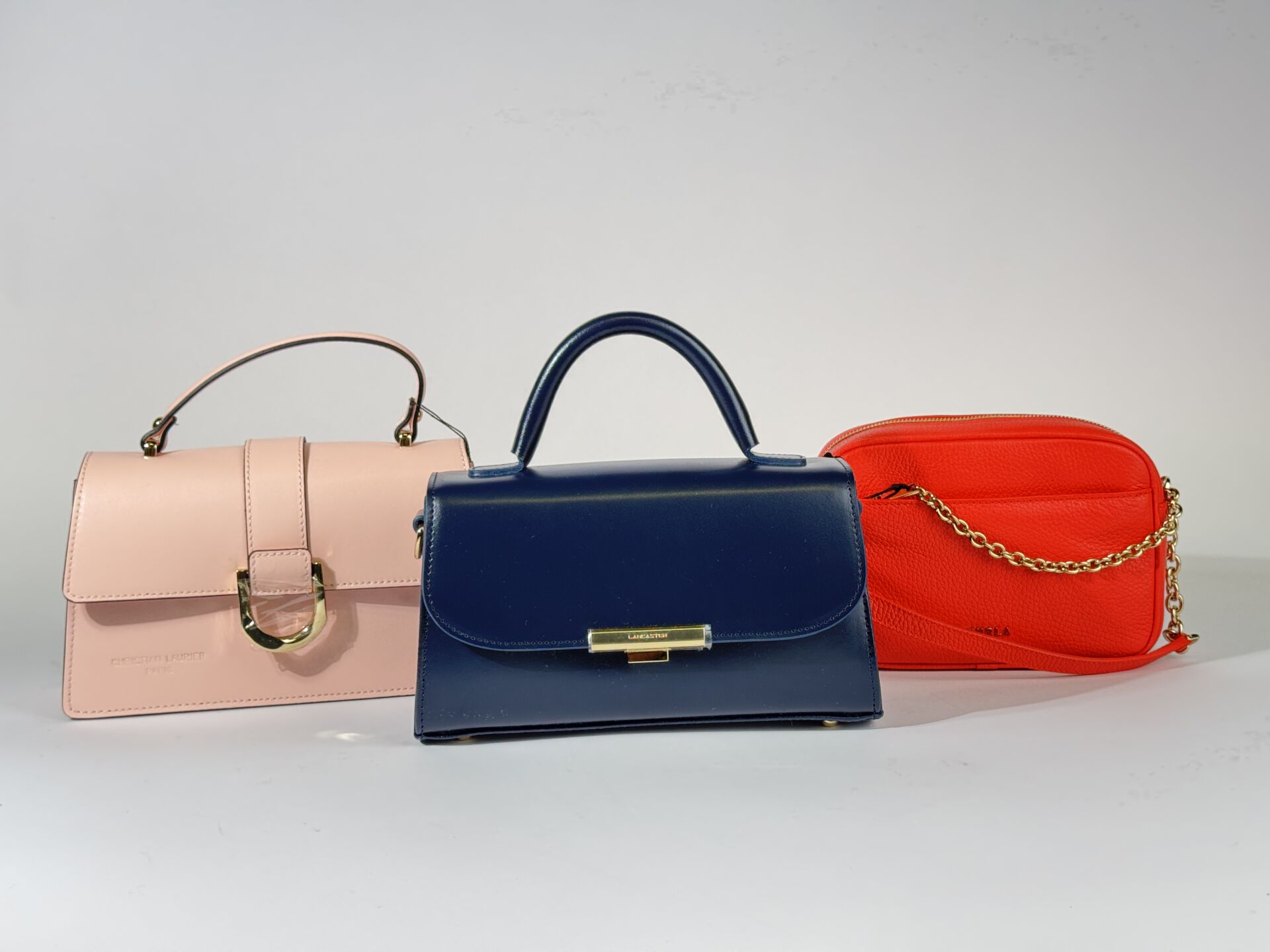 Lot comprenant trois sacs à main : - CHRISTIAN LAURIER - Petit sac à rabat en cuir rose pale, poignée et anse bandoulière à la couleur, fermture aimantée. Haut. : 13 cm - Long. : 25 cm - FURLA - Petit sac caméra en cuir grainé coquelicot, fermeture à glissière, anse bandoulière cuir et chaine métal doré. Haut. : 15 cm - Long. : 20 cm - LANCASTER - Petit sac à rabat en cuir marine, poignée et anse bandoulière à la couleur. Haut. : 14 cm - Long. : 25,5 cm Etat magasin