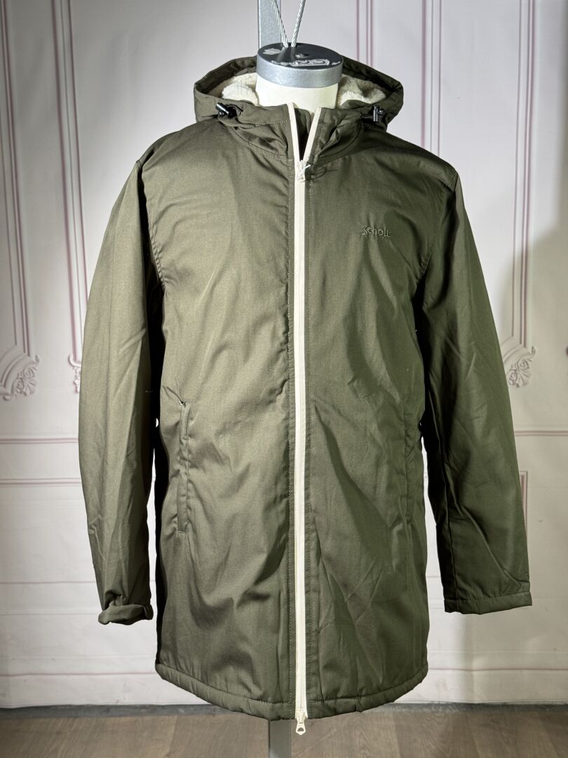 SCHOTT - Doudoune en polyester et coton kaki, fermeture zippée, deux poches en biais zippées, capuche. Taille L Etat magasin
