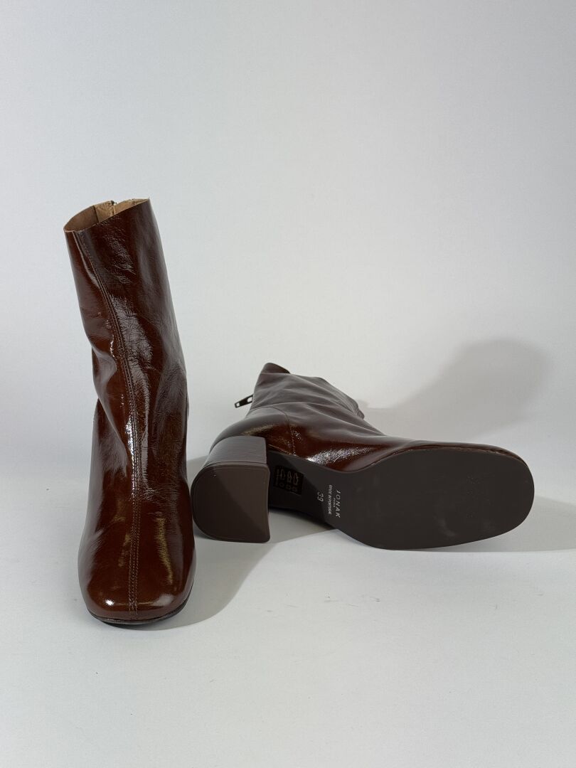 JONAK - Paire de bottines à talon, modèle "Donali", cuir brillant caramel. Boite (abimée). Pointure 39 - Haut du talon : 7,5 cm Etat magasin