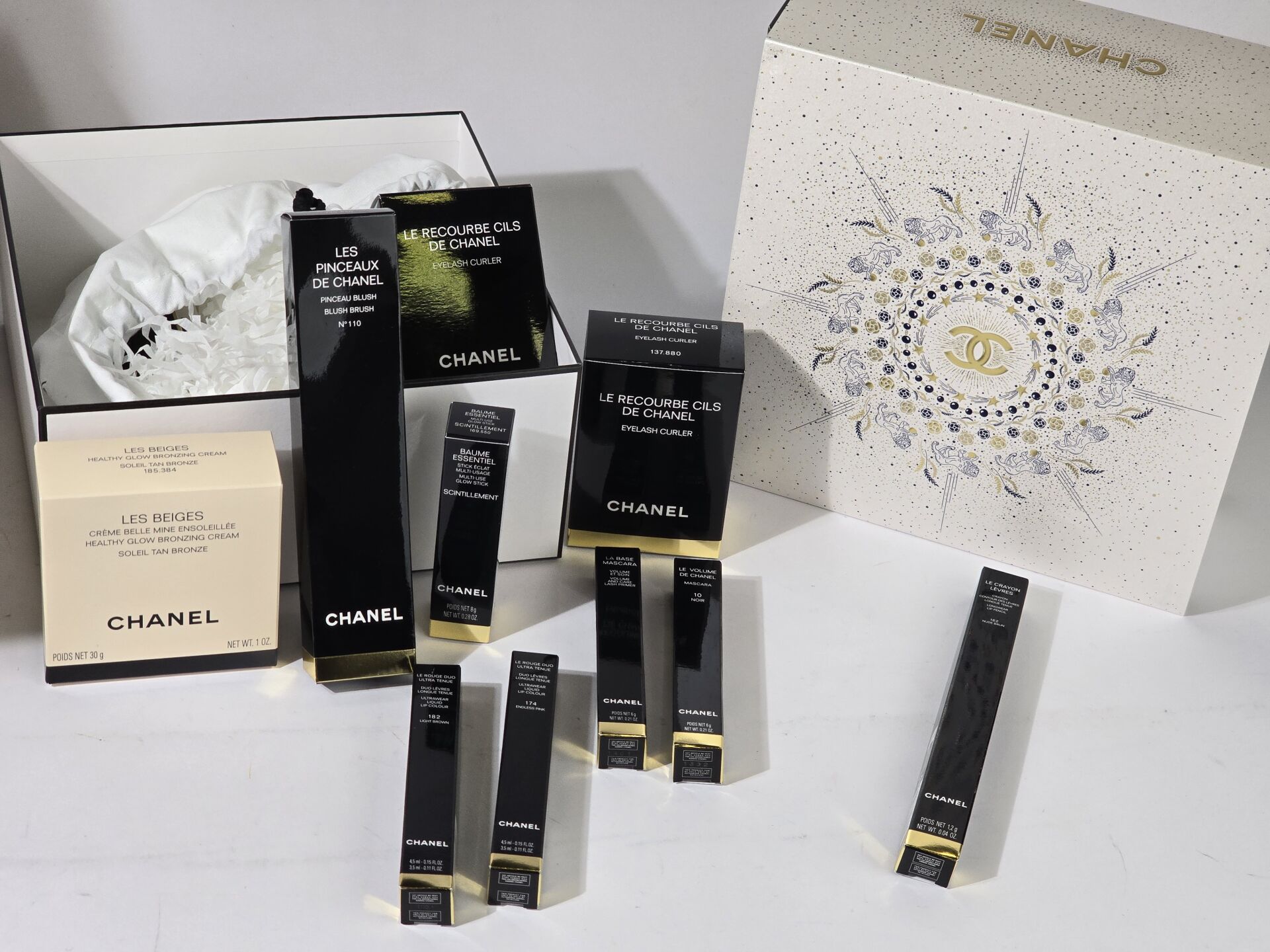 CHANEL - Un coffret cadeau 10 produits maquillage de la marque : 2 "recourbe cils", une crème belle mine et son pinceau, un mascara volume noir et sa base, 2 Rouge à lèvres duo "174 endless pink" et "182 light brown", un baume essentiel stick multi usage "scintillement" et un crayon lèvres 162 "nude brun".