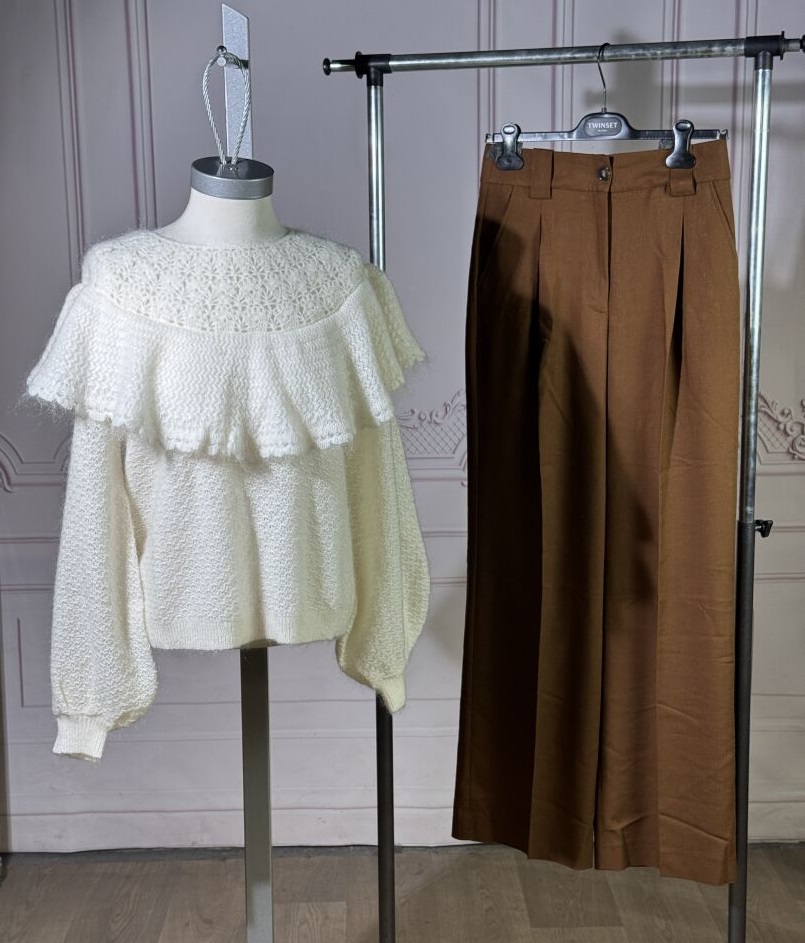 SEZANE - Lot comprenant un pantalon modèle "Théophile" en viscose chocolat (taille 38) et un pull volanté modèle "Amélia" en mailles fantaisie blanches, manches longues bouffantes (taille M). Etat magasin