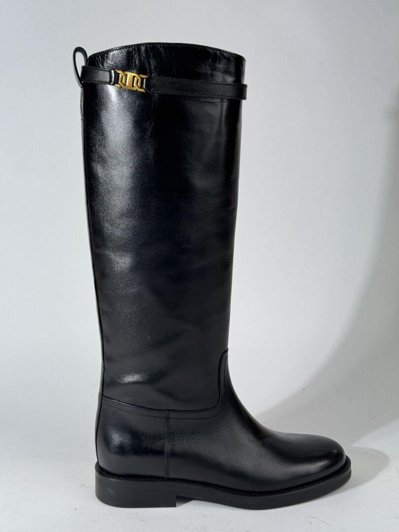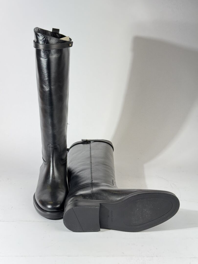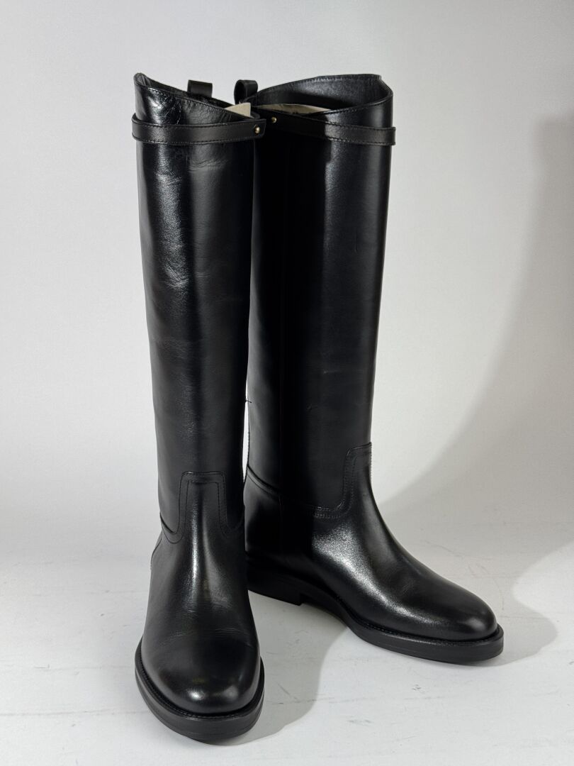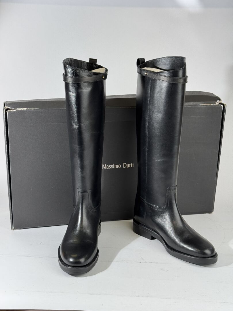 MASSIMO DUTTI - Paire de bottes cavalières en cuir noir, petit talon. Boite (abîmée). Pointure 39 - Haut du talon : 3 cm Etat magasin