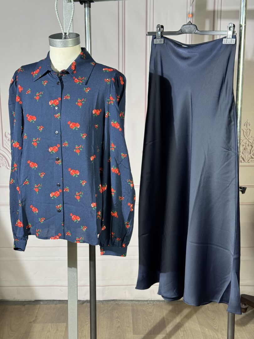 SAAJ - Ensemble comprenant une jupe longue en satin marine (taille 1) et un chemisier en coton marine imprimé de roses rouges (taille 2). Etat magasin