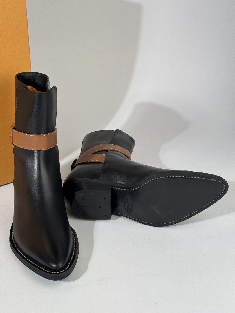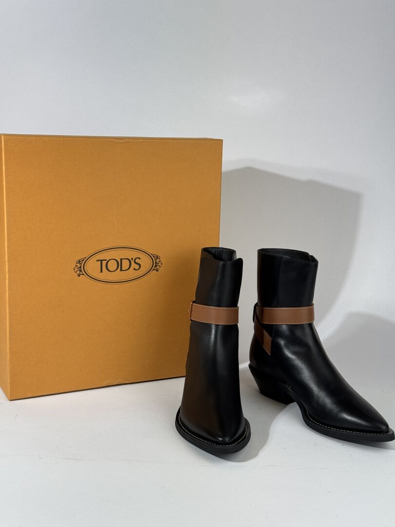 TOD'S - Paire de bottines style santiags modèle "Ankle", à petits talons, cuir noir, lanière cuir camel, bout pointu. Boite. Pointure 36 Etat magasin