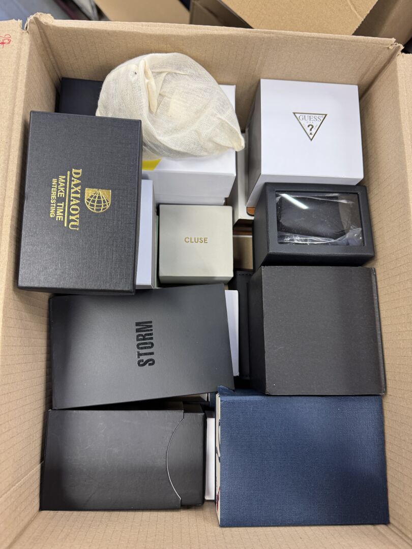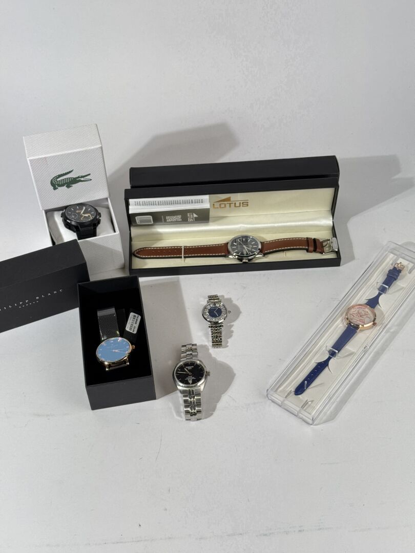 Fort ensemble d'environ 20 montres. Diverses marques dont LOTUS, FRAGONARD, PHILIPP BLANC, TISSOT, EMPORIO ARMANI,… La majorité dans leur boite En l'état