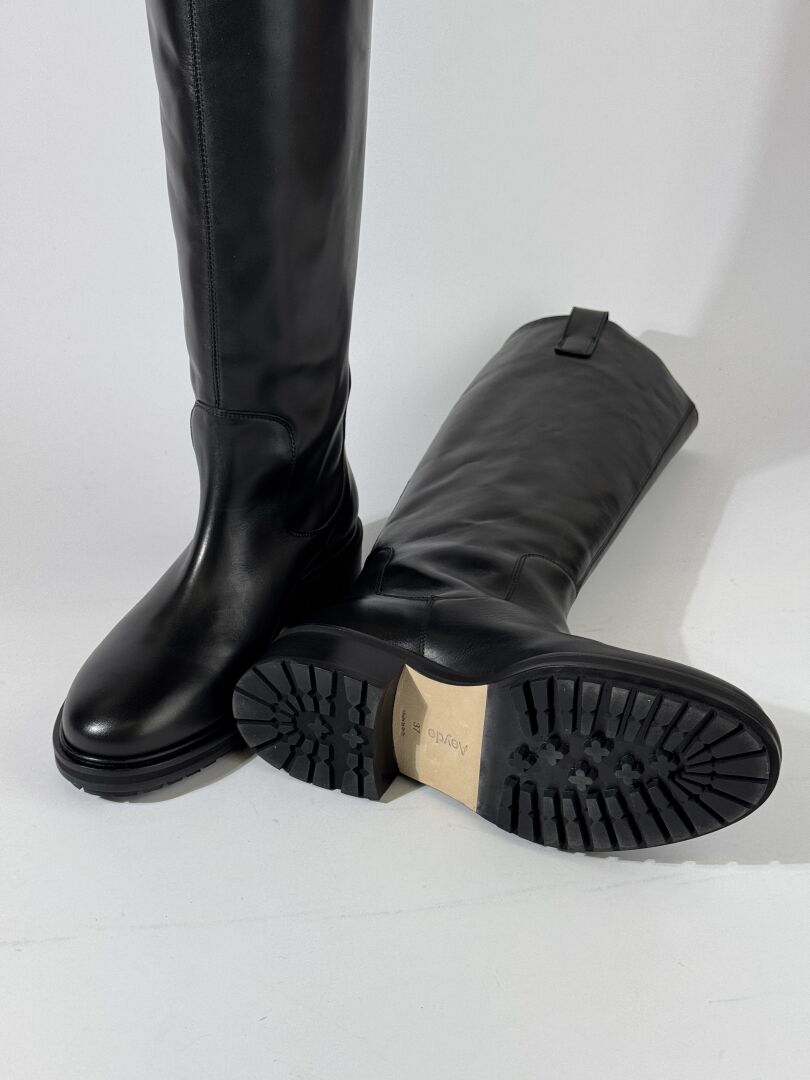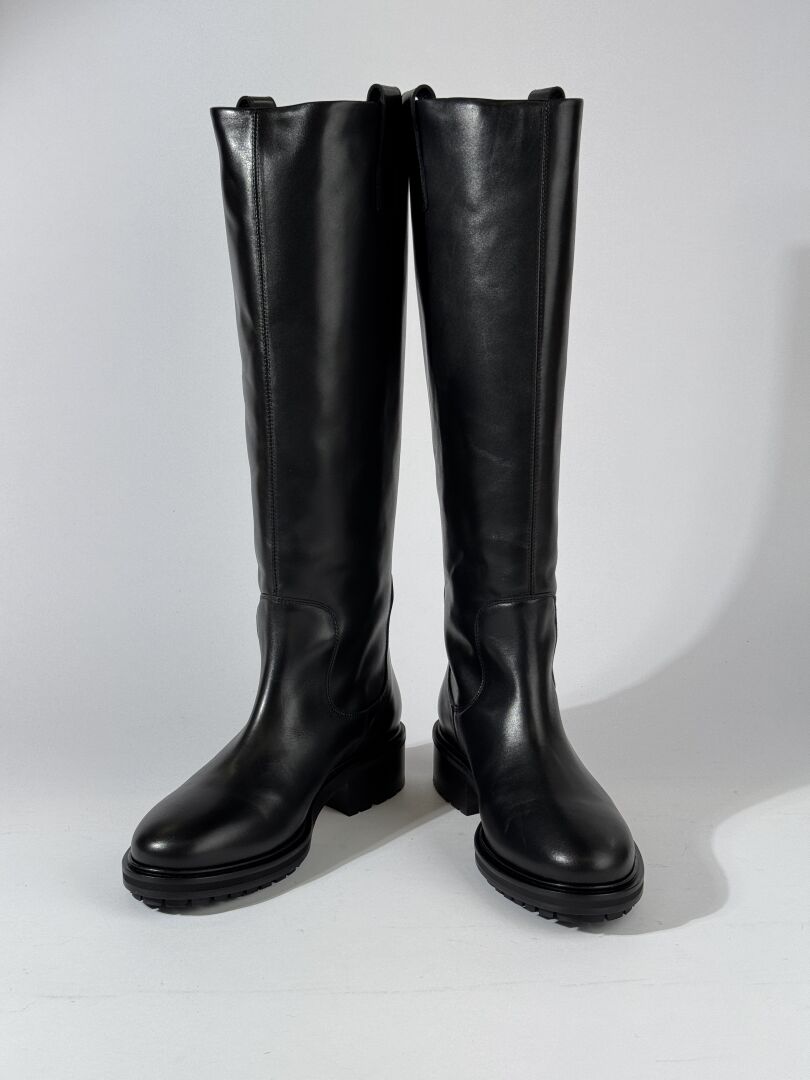 AEYDE - Paire de bottes en cuir noir, semelles crantées, petit talon. Pointure 37 - Haut du talon : 4 cm Etat magasin