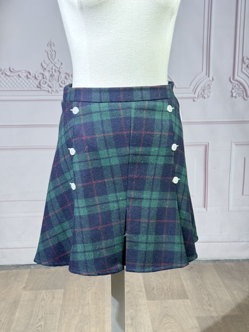 SALUT BEAUTE - Jupe courte, plis creux, tartan vert et bleu, boutons, fermeture à glissière latérale. Taille indiquée 38 Déjà portée, bon état