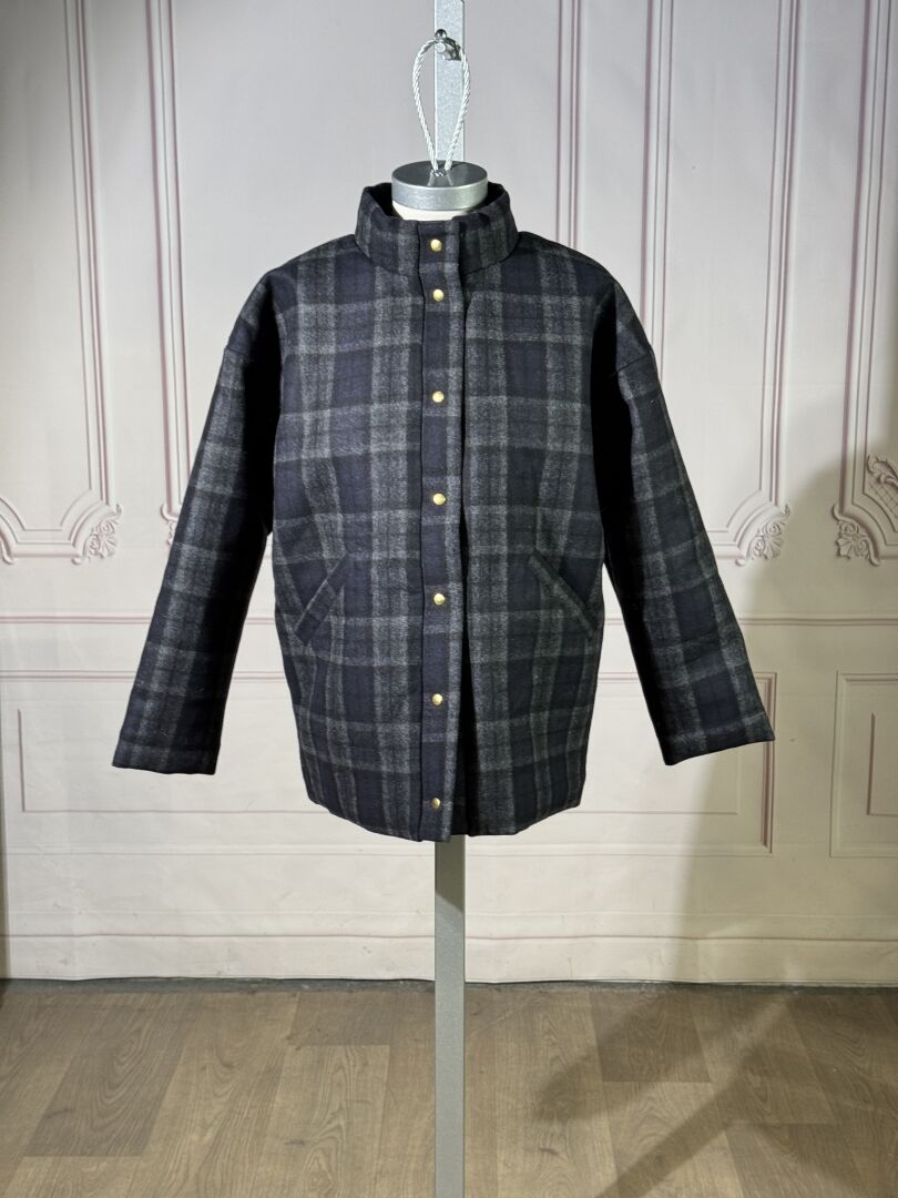 ATELIER CAMILLE - Manteau court en laine mélangée tartan gris, boutonnage pression, manches longues, deux poches en biais. Taille indiquée 0 Etat magasin