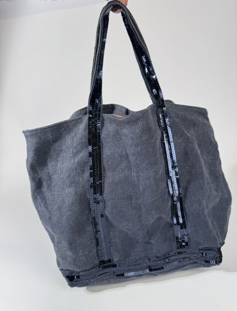 VANESSA BRUNO - Sac cabas en lin marine rebrodé de sequins à la couleur, double poignées, poche intérieure zippée. Haut. : 29 cm - Long. : 26 cm Bon état, déjà porté, petite trace dessous