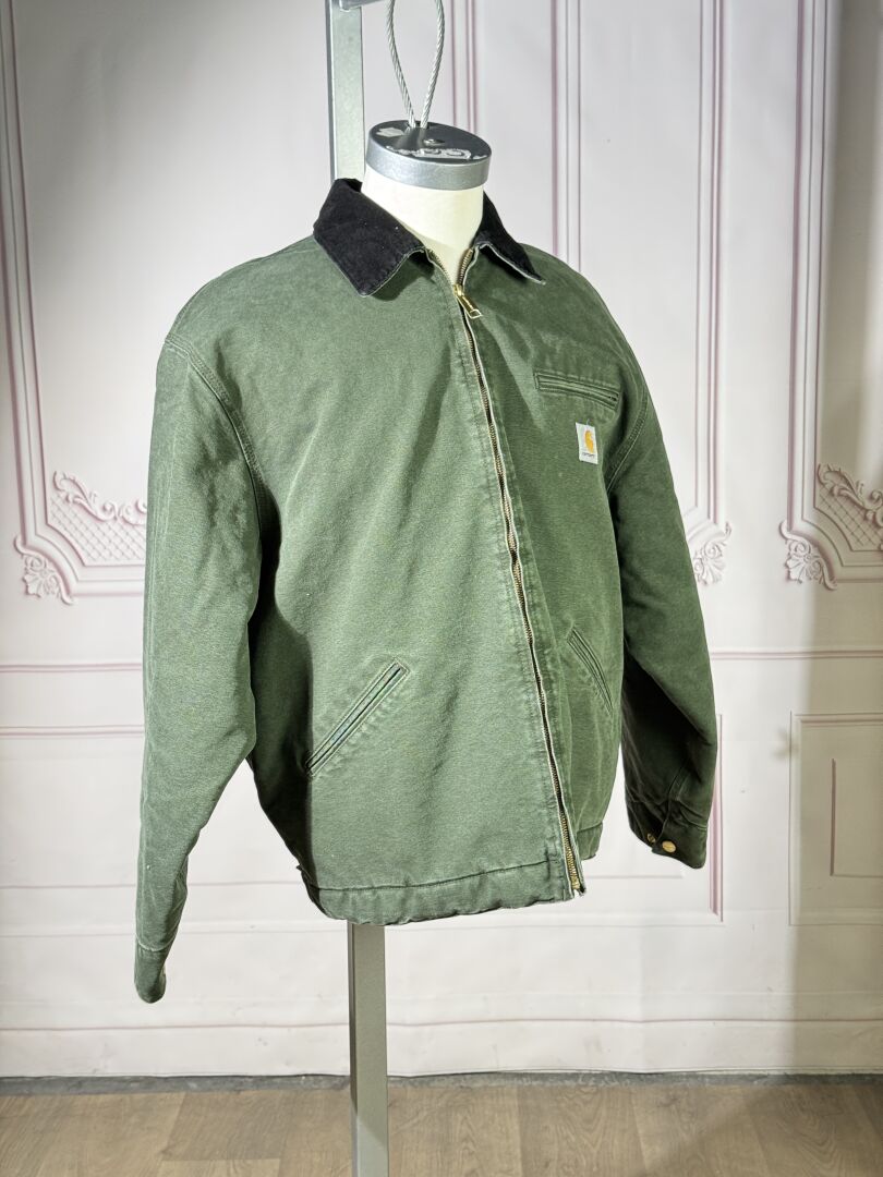 CARHARTT - Veste homme modèle "Detroit", coton vert olive, revers du col en velours côtelé noir, fermeture à glissière, deux poches en biais. Taille L État magasin