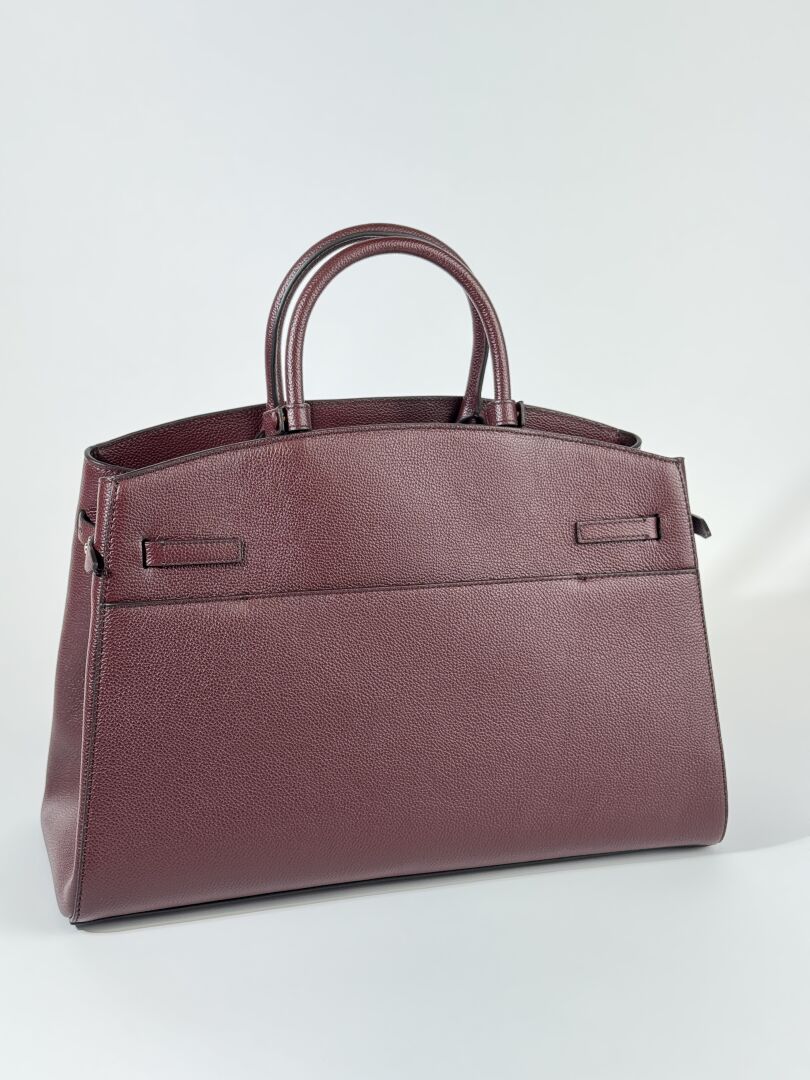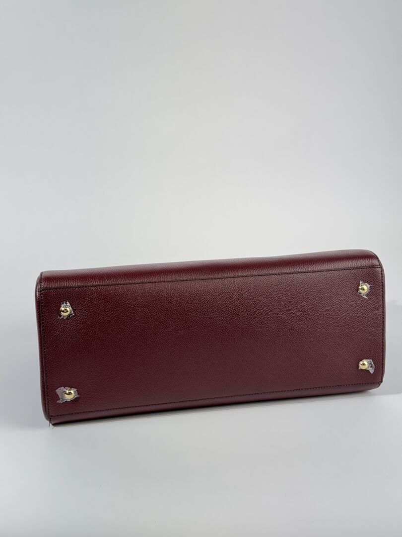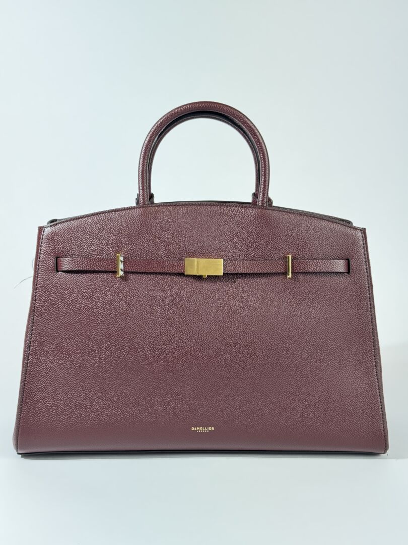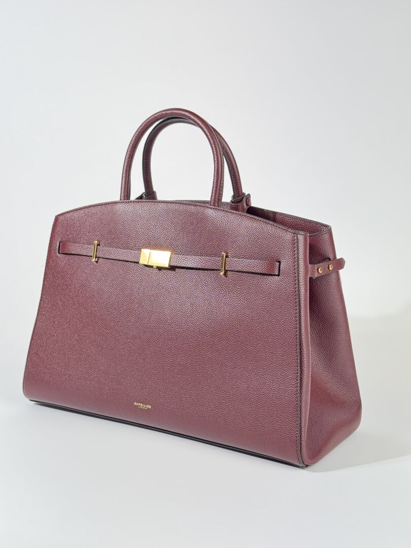 DEMELLIER - Sac "Hudson" en cuir grainé bordeaux, deux poignées et anse bandoulière à la couleur, accastillage métal doré. Haut. : 25 cm - Long. : 39,5 cm Etat magasin