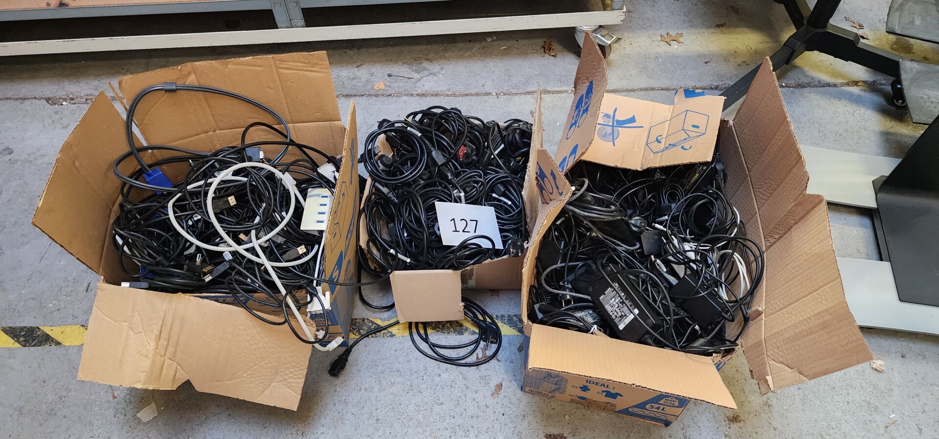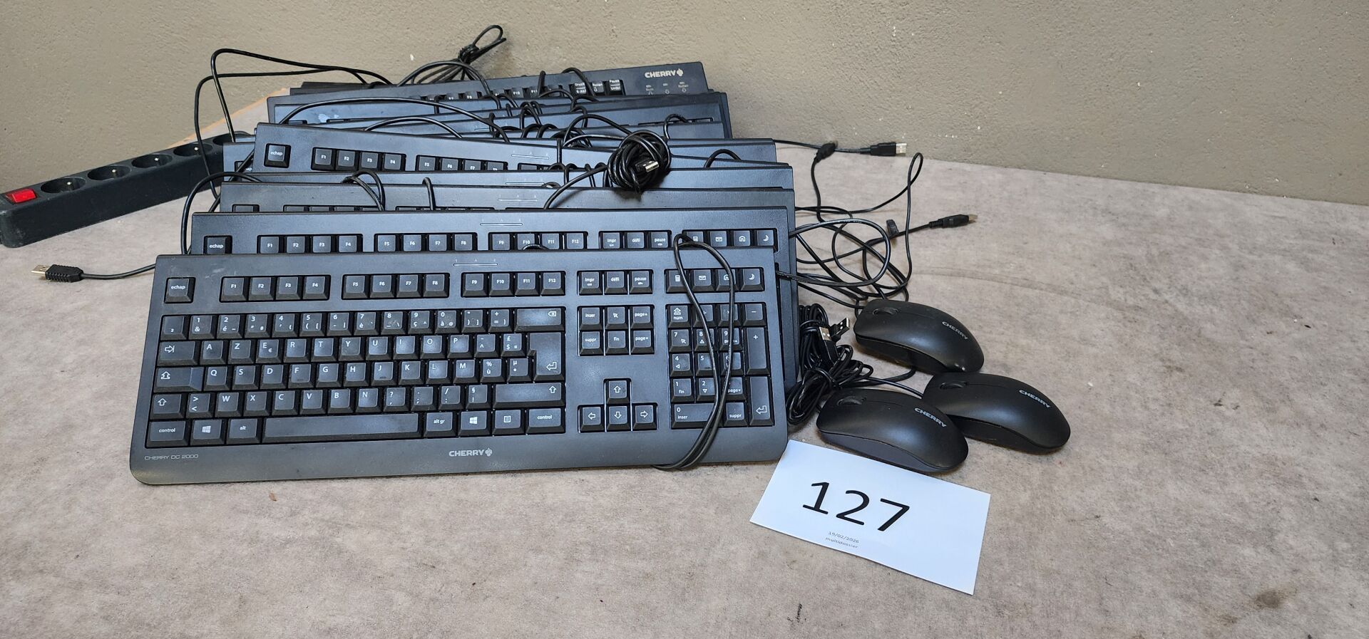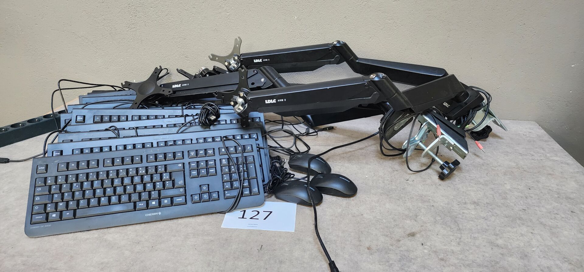 17 claviers CHERRY, 10 souris filaires CHERRY, dans 3 cartons 1 ensemble de câbles d'alimentation et connectique dont : chargeurs PC portable, câbles pour écrans et UC, 3 bras articulés doubles dont 2 LDLC ARM 2 et FELLOWES