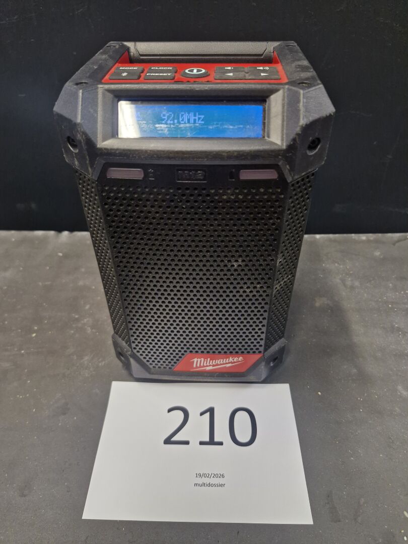 1 chargeur de batterie MILWAUKEE, modèle C 12 C NS : 17033711 1 radio de chantier autonome MILWAUKEE, modèle M 12 RCDAB + NS : 17024277, 1 batterie