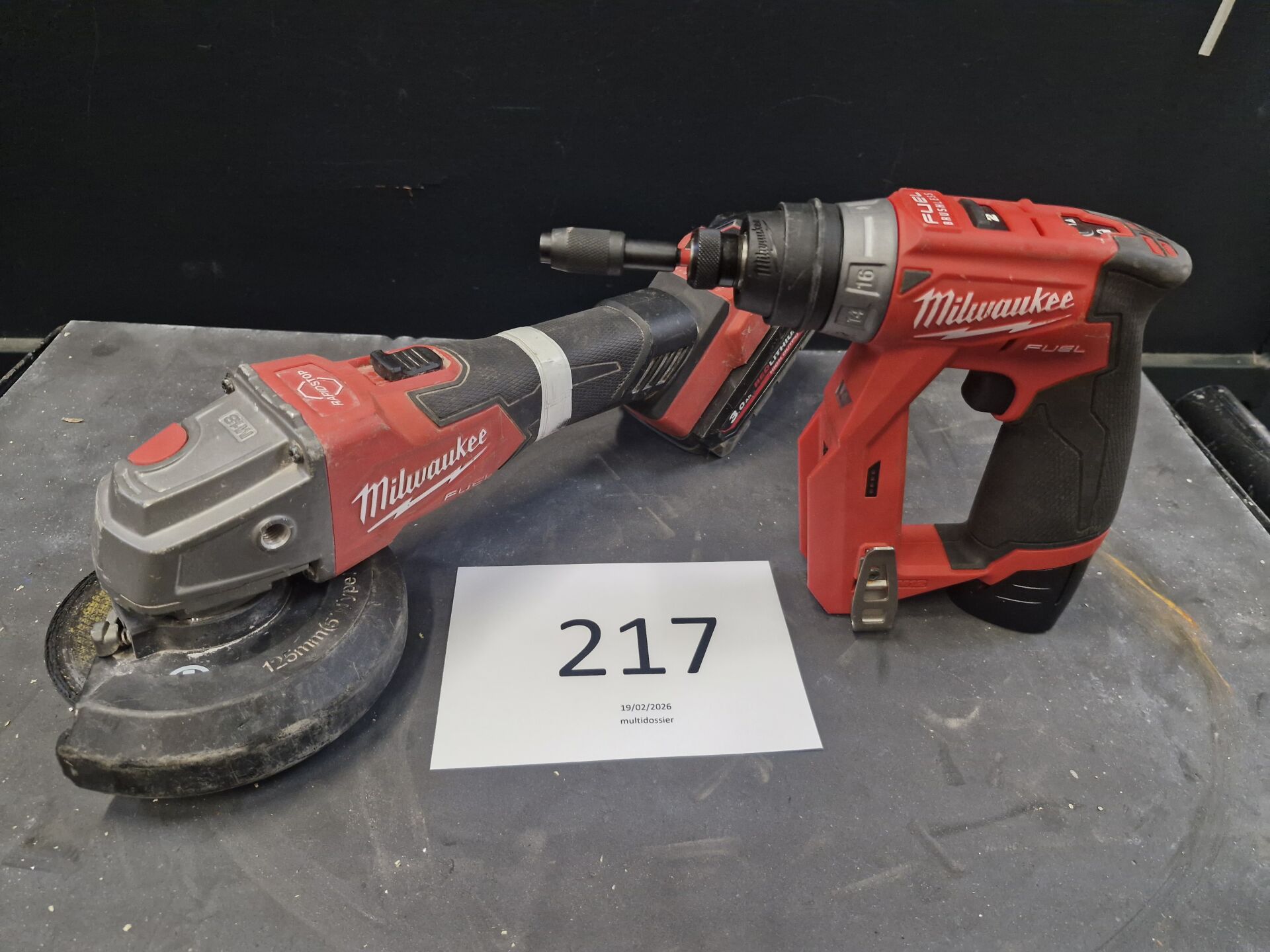 1 visseuse autonome MILWAUKEE, modèle M 18 FDDX NS : 17024272 , 2 batteries, 1 chargeur 1 batterie MILWAUKEE, modèle M 12 2 Ah sans chargeur 1 meuleuse autonome MILWAUKEE, modèle M 18 FS AG 125 XB NS : 17024279 1 batterie, sans chargeur