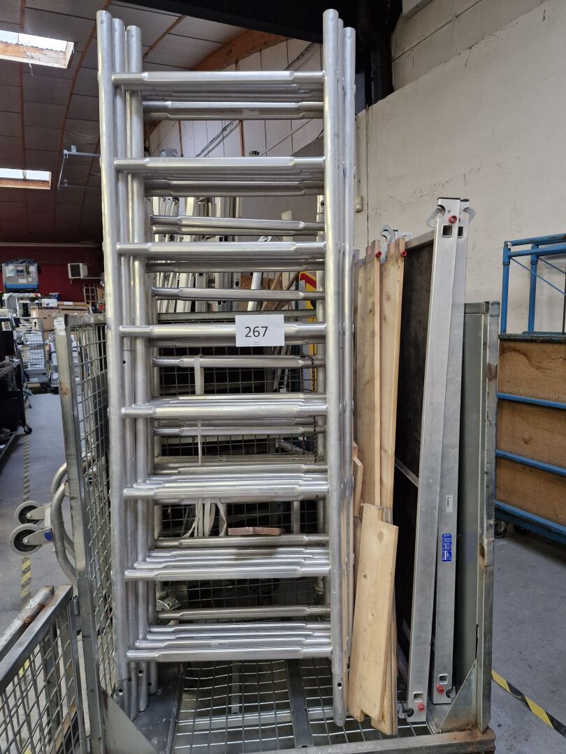 Eléments d'échafaudage mobile alu comprenant 8 échelles : 6 de 200 cm et 2 de 150 cm, 2 plateaux de 150x 60 cm