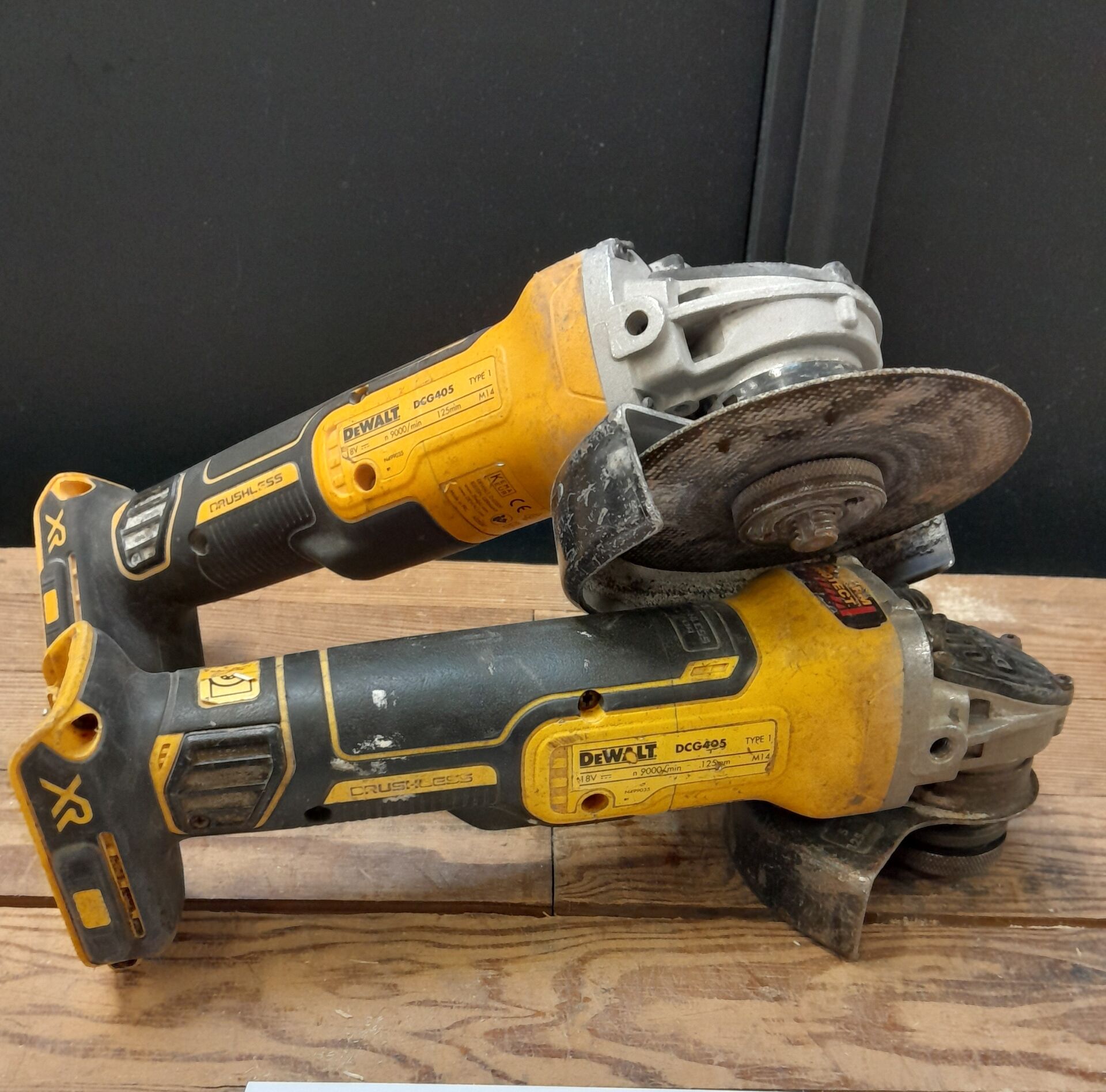 2 meuleuses d'angle autonomes DEWALT modèle DCG405 diamètre du disque 125 mm