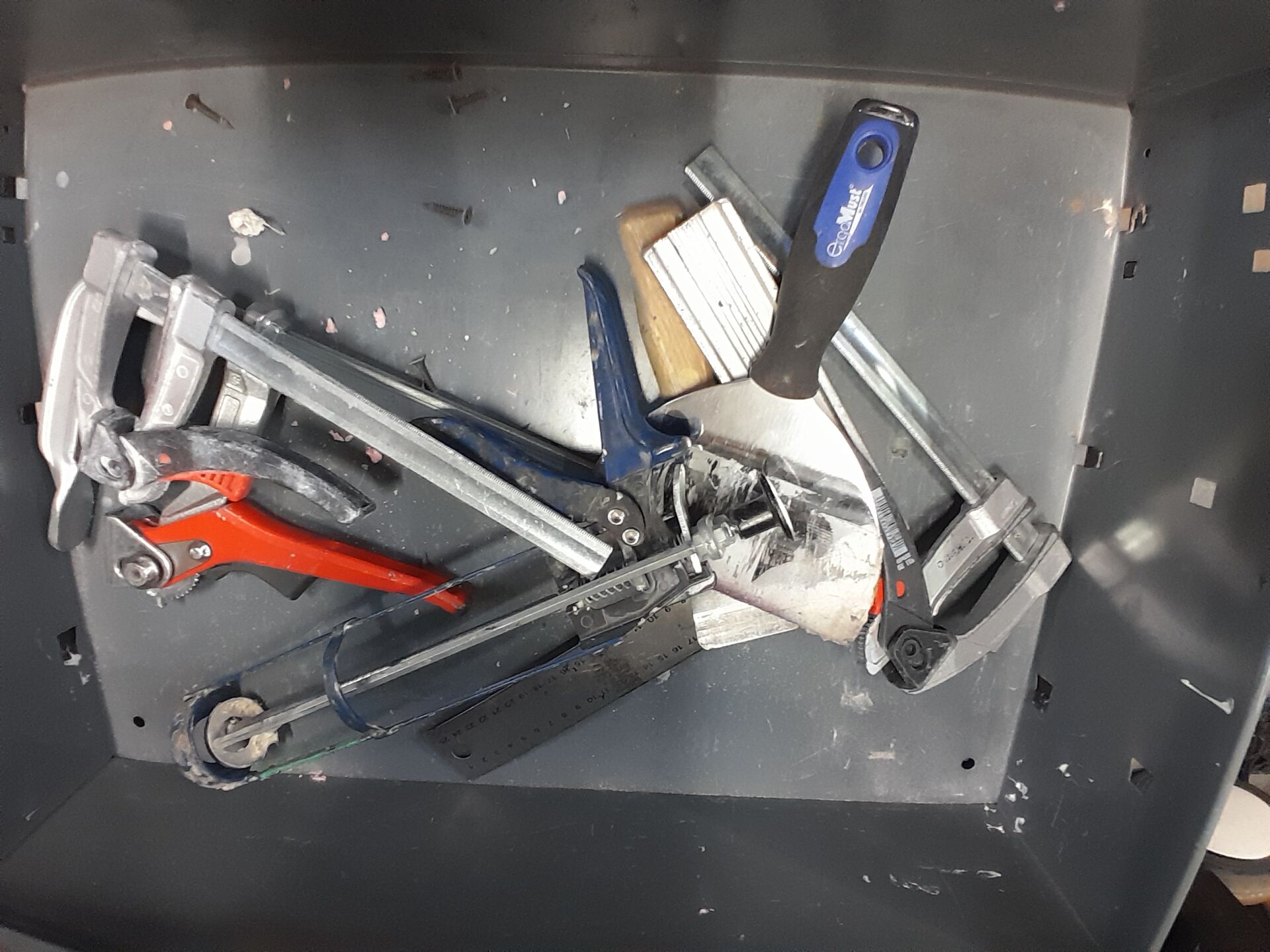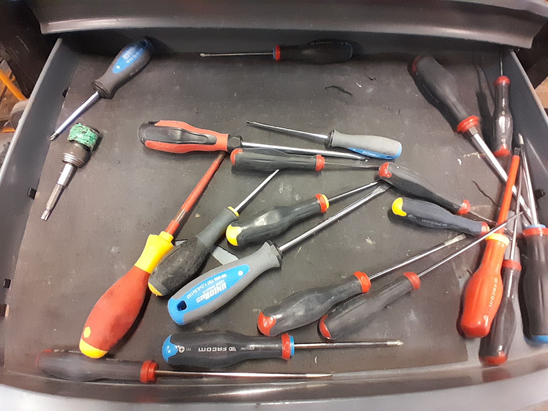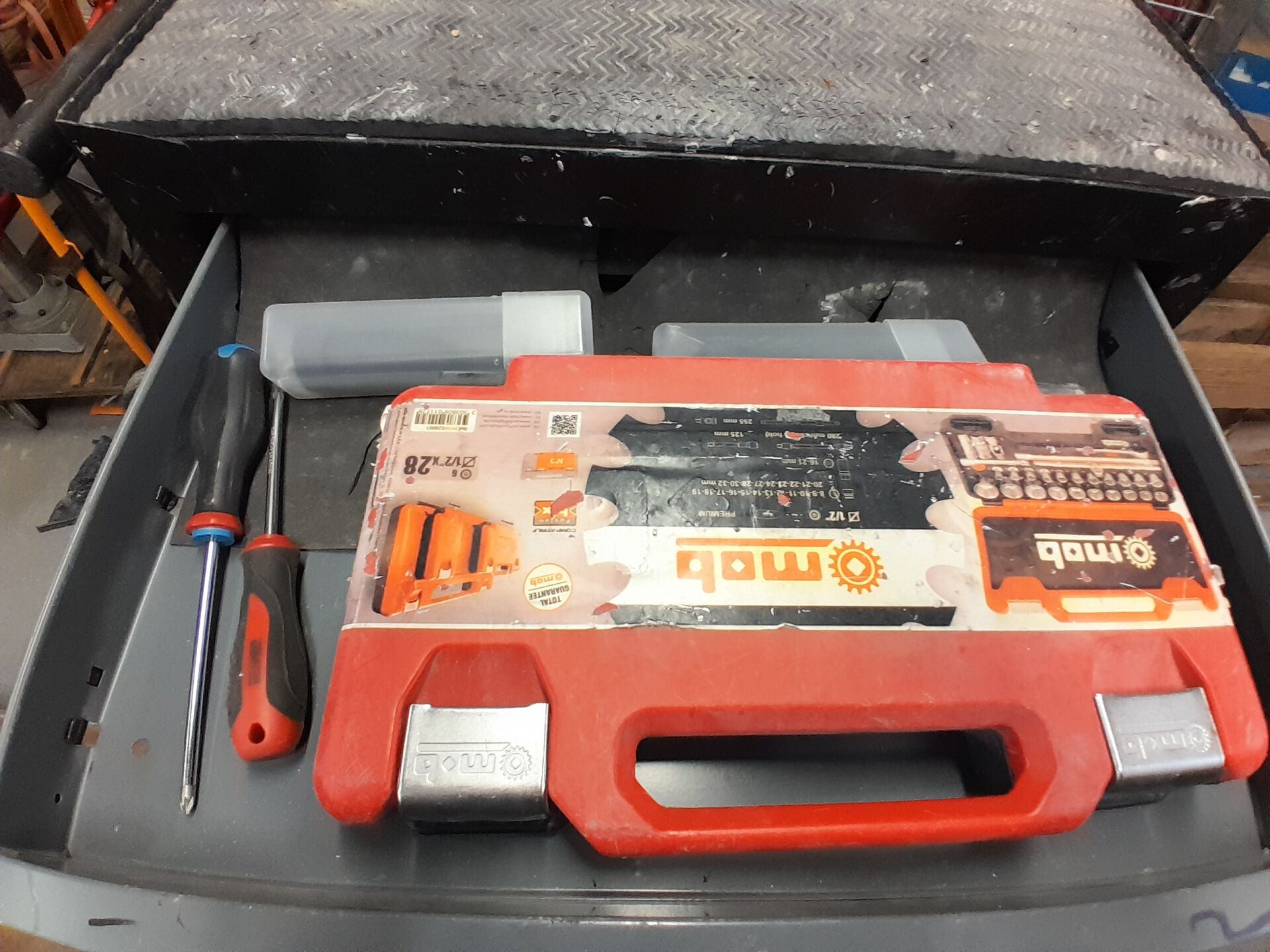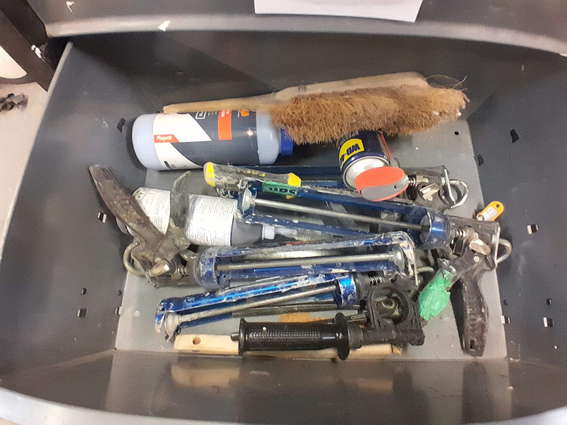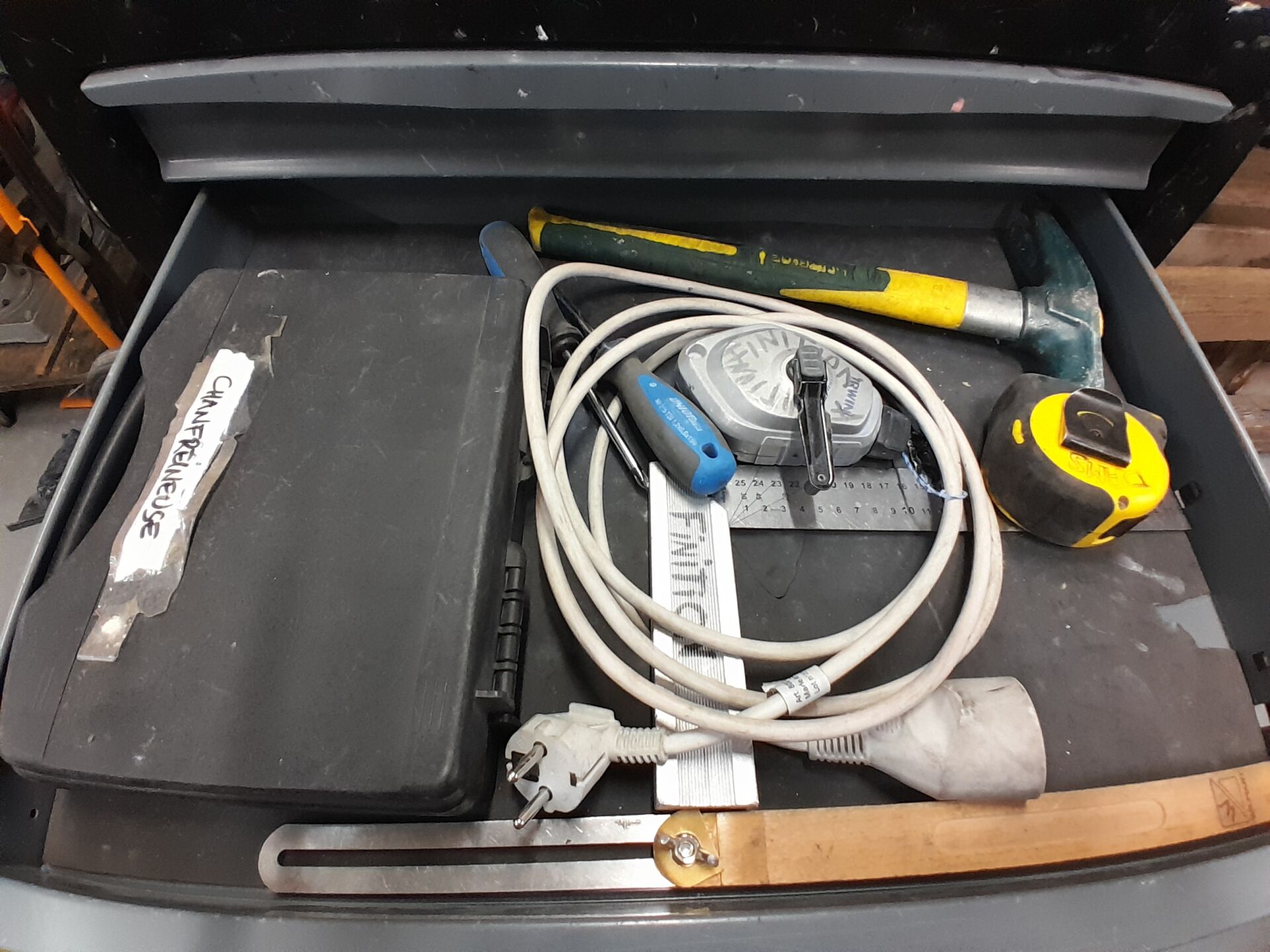 1 servante sur roulettes 6 tiroirs model CLASSIC 3 de marque MOB dimension : 77 L X 100 H X 46 P ont y ajoute le contenue comprenant des outils dont : marteaux , tournevis ETC …
