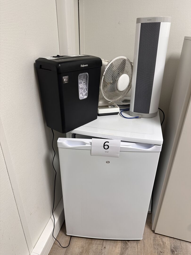 Vendu le 19 02 2026 à 10h à NANTES 24 rue du marché commun, visible le 18 02 26 à 8h30 sur RDV à NANTES (Chantenay) , enlèvement le 26 02 2026 de 9h à 11h , frais de mise à disposition 10€ TTC par lot 1 réfrigérateur table-top BOULANGER 1 chauffage d'appoint EQUATION 1 petit ventilateur 1 destructeur de documents FELLOWES P30-C