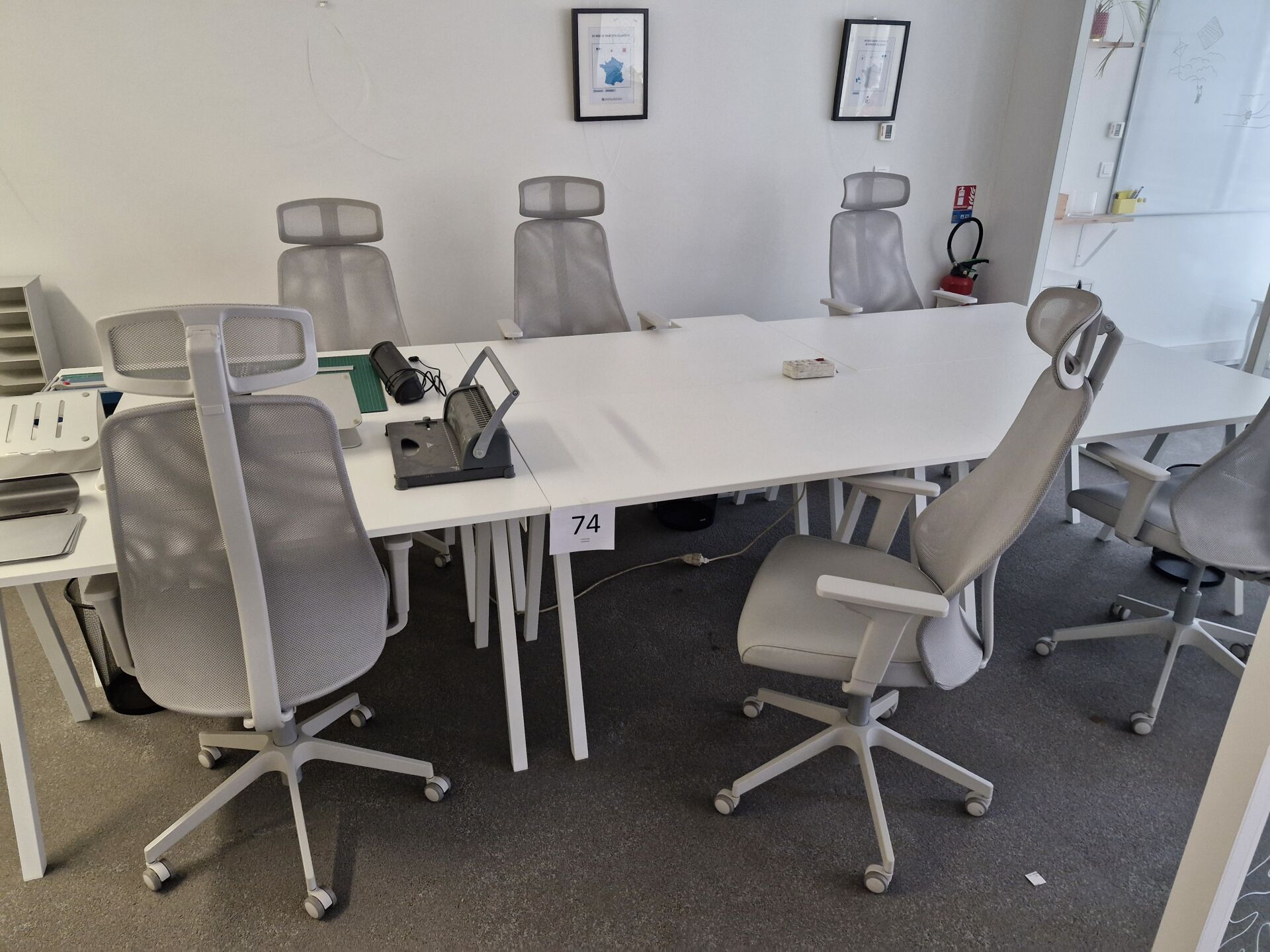 Vendu sur désignation le 19 02 2026 à 10h à NANTES 24 rue du marché commun, Visible à Nantes (Ile de Nantes) le 19 02 2026 à 8h30 sur RDV, enlèvement le 26 02 26 de 13h à 17h, frais de mise à disposition 10 € TTC par lot 1 plastifieuse A3 GBC, 1 massicot A3 DAHLE 534, 1 tapis de souris et supports de clavier métal 6 bureaux mélaminé blanc 120 x 70 cm 5 caissons 1 porte mélaminé blanc, 35 x 35 x 70 cm 6 fauteuils tournants/roulants, filet et simili cuir gris, 1 tableau blanc 120 x 90 cm 1 téléphone autonome PANASONIC