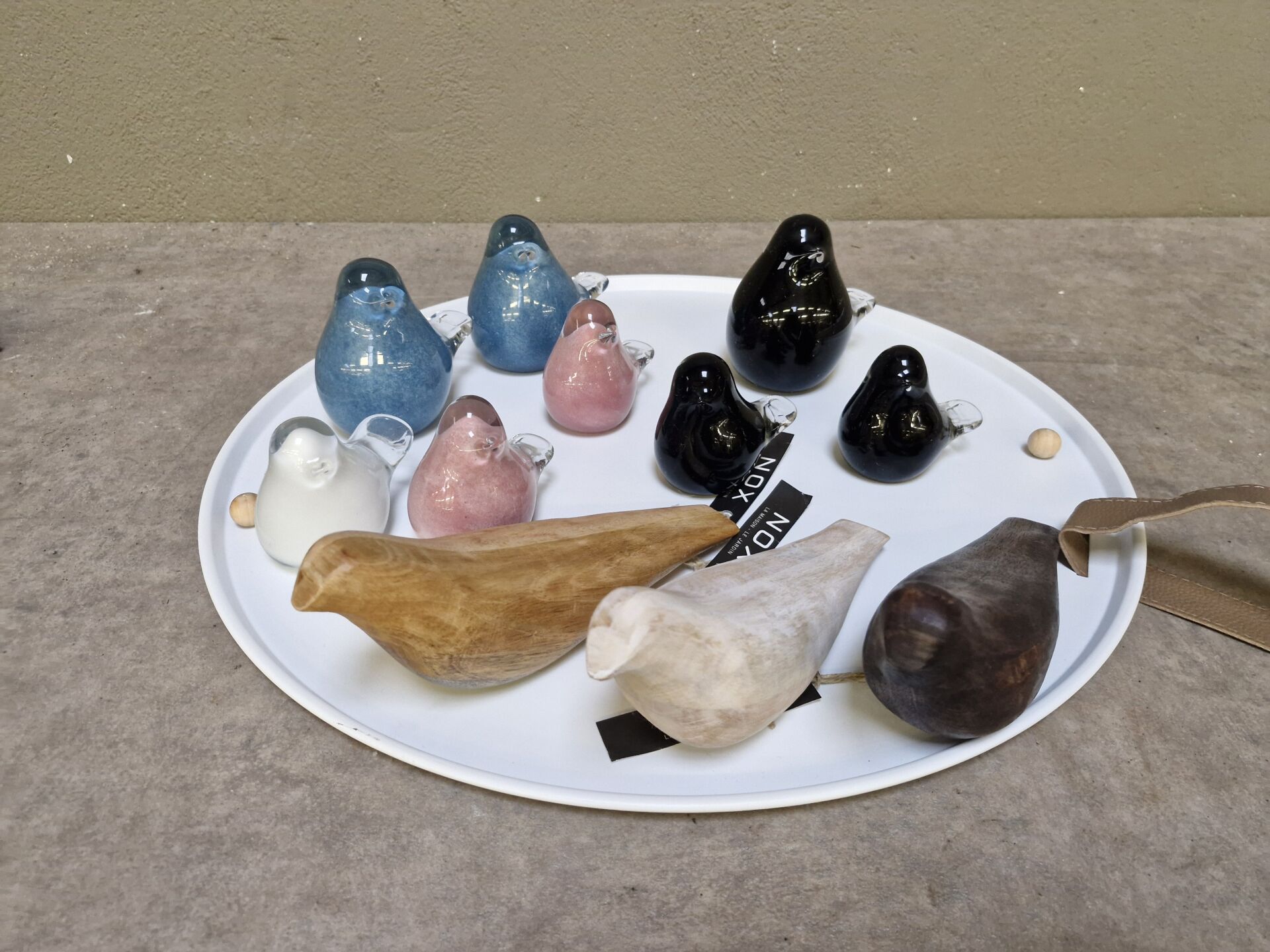 1 plateau circulaire métal laqué blanc diam 50 cm, 8 statues oiseau en verre coloré et 3 statues oiseau en bois