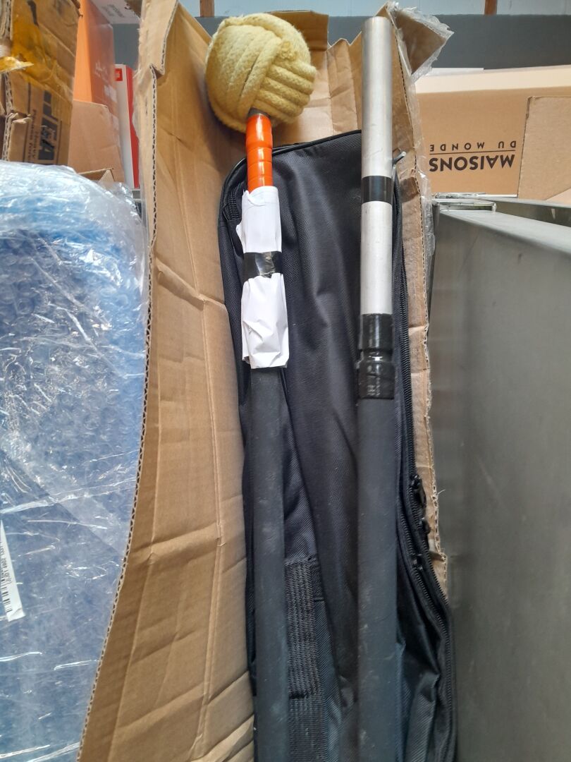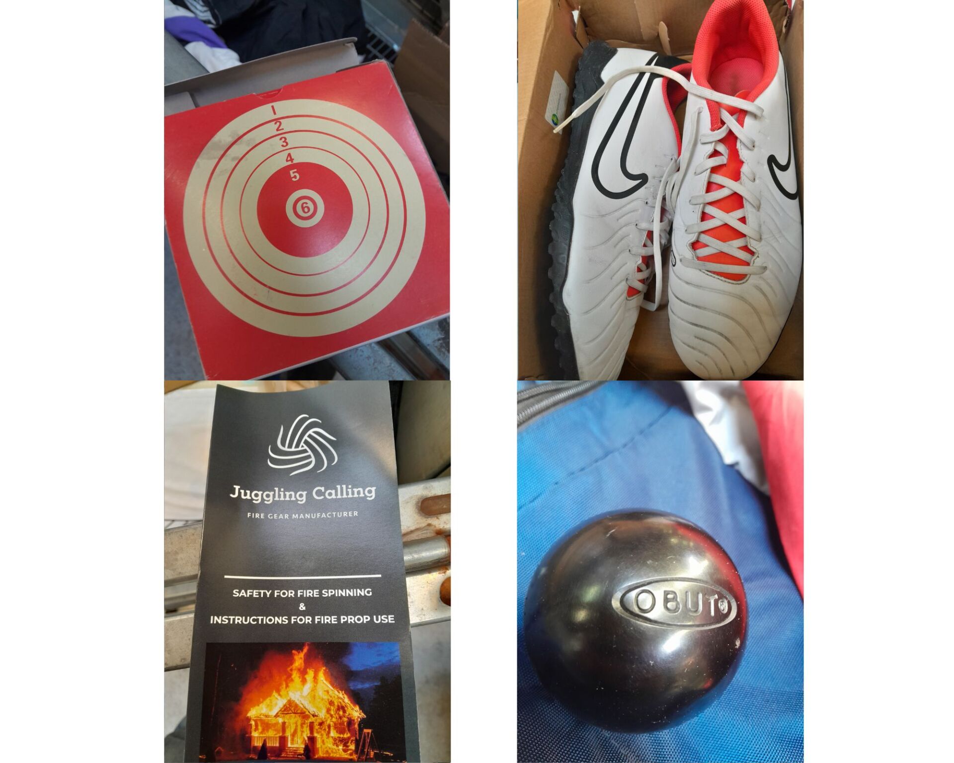 FORT ENSEMBLE D'ARTICLES SPORT & LOISIRS DONT BARRE POUR JONGLEUR DE FEU , CHAUSSURES , SAC , TAPIS DE MARCHE , LUGE , SAC NAUTIQUE , SAC DE COUCHAGE , BOULE DE PETANQUE , POIDS , CIBLE DE TIR , CANNE A PECHE / TYPHOON , PITPAT , JUGGLING CALLING , ECOHUB, NIKE , OBUT (expédition sur devis) (traces d'usage, retour sav, avarie de transport, seconde main, en l'état)