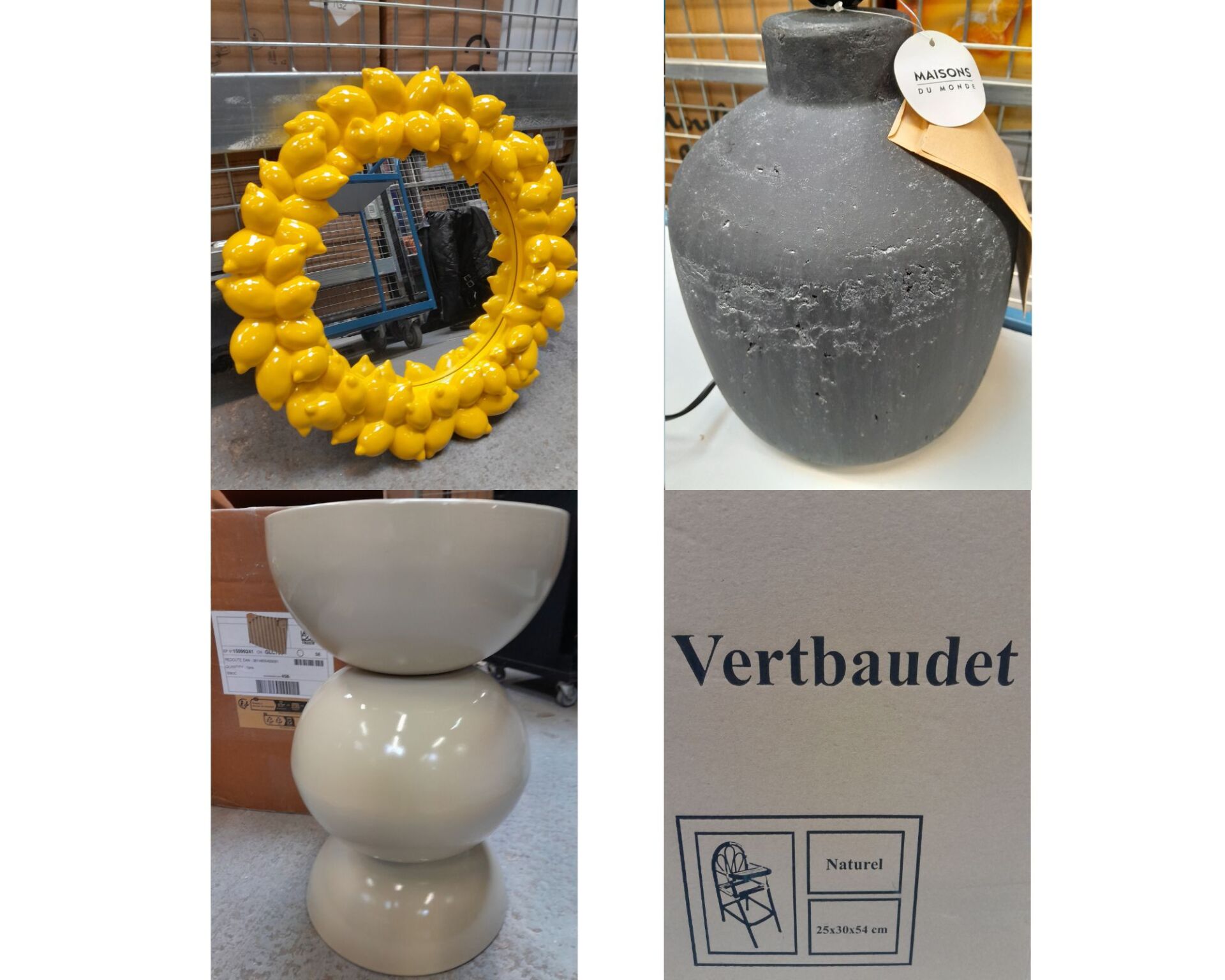 FORT ENSEMBLE DE PETITS MOBILIERS ET DECORATIONS (environ 1m3) DONT MIRROIR , LAMPE , CHAISE POUR ENFANT , LUMINAIRE , MEUBLE DE RANGEMENT , TABOURET , CHAISE , VASE , PANIER , HORLOGE / VERTBAUDET , LAREDOUTE , METROPOLIGHT , LOBERON , MAISONS DU MONDE , SENSEA , DELINIA (expédition sur devis) Lot issu de colis non réclamés : état de fonctionnement non garanti.