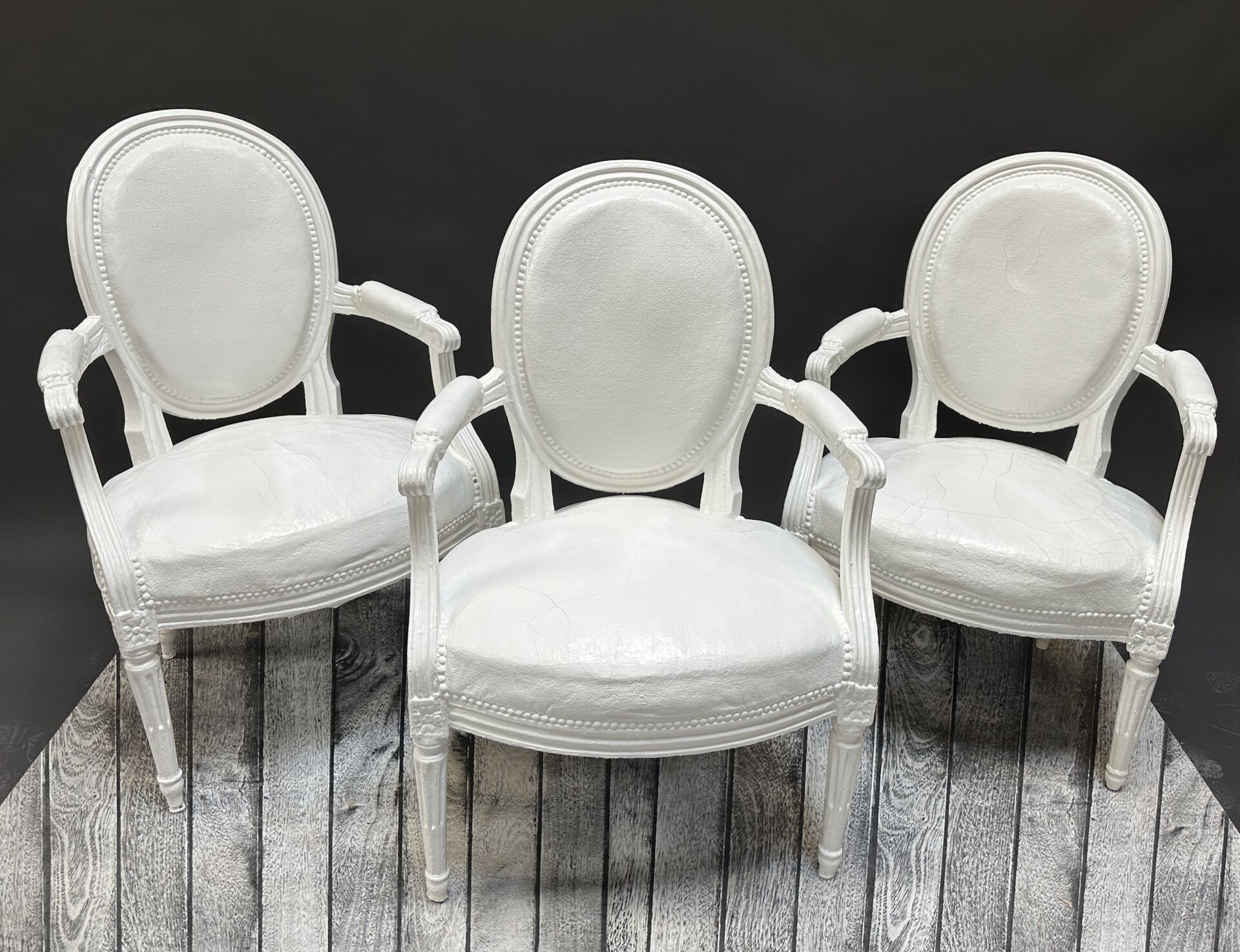 Suite de trois fauteuils en bois à dossier médaillon, les pieds fuselés, cannelés, rudentés. Intégralement laqué blanc (fortes restaurations, coulures). Epoque Louis XVI. Haut. : 90 cm - Larg. : 59 cm - Prof. d'assise : 47 cm