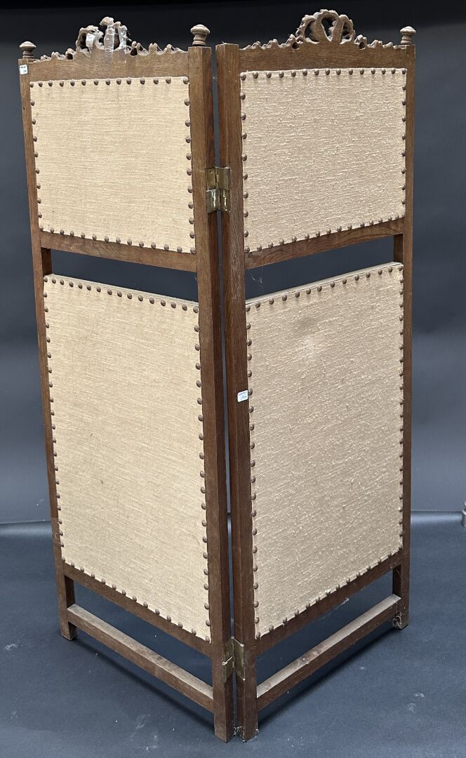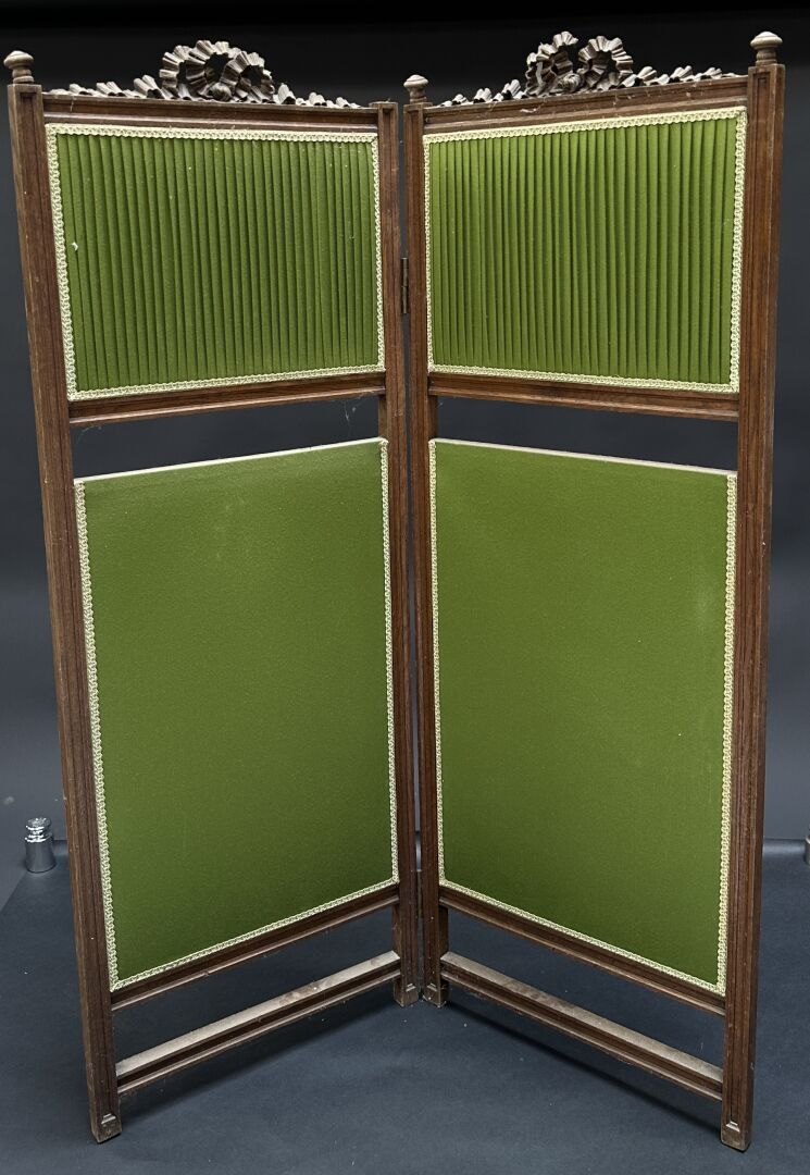Paravent à deux feuilles en bois naturel mouluré et sculpté d'un noeud de ruban, garni d'un tissu vert, plissé en partie haute (accidents et manques). Style Louis XVI. Haut. : 129 cm - Larg. une feuille : 47 cm