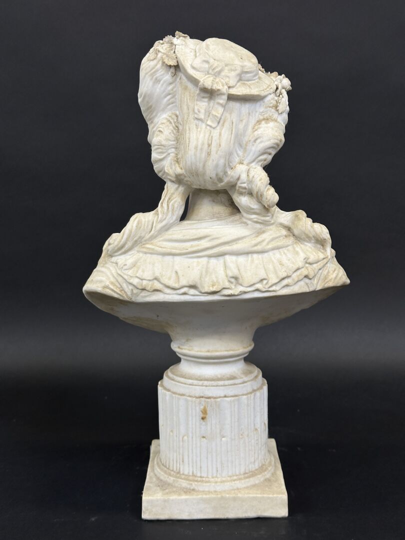 Portrait présumé en buste de la princesse de LAMBALLE. Sujet en biscuit sur une colonne cannelée rudentée et ornée d'une couronne de laurier (petits accidents notamment à la fleur à l'avant). Fin du XIXe siècle. Haut. : 36 cm - Larg. : 21 cm - Prof. : 11 cm La princesse de LAMBALLE, amie de la reine Marie-Antoinette, fut emprisonnée lors de la Révolution Française puis massacrée en 1792. Sa tête fut promenée dans tout Paris au bout d'une pique.