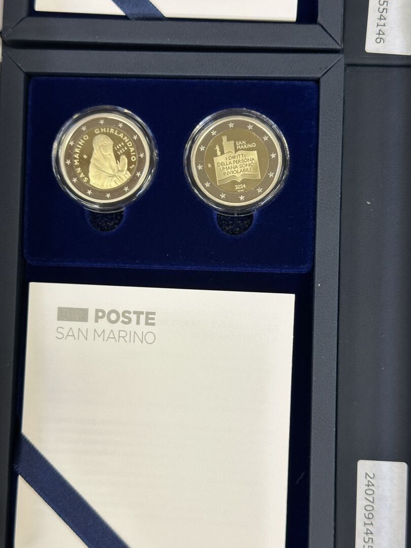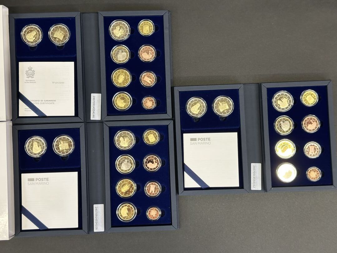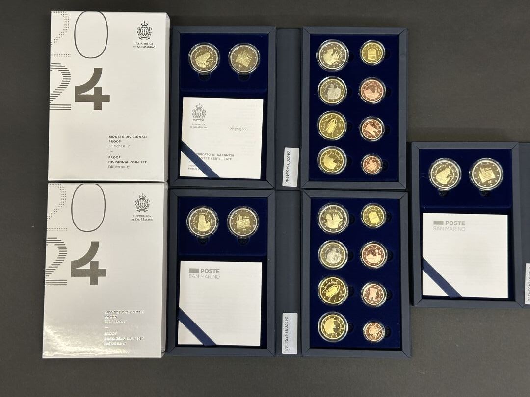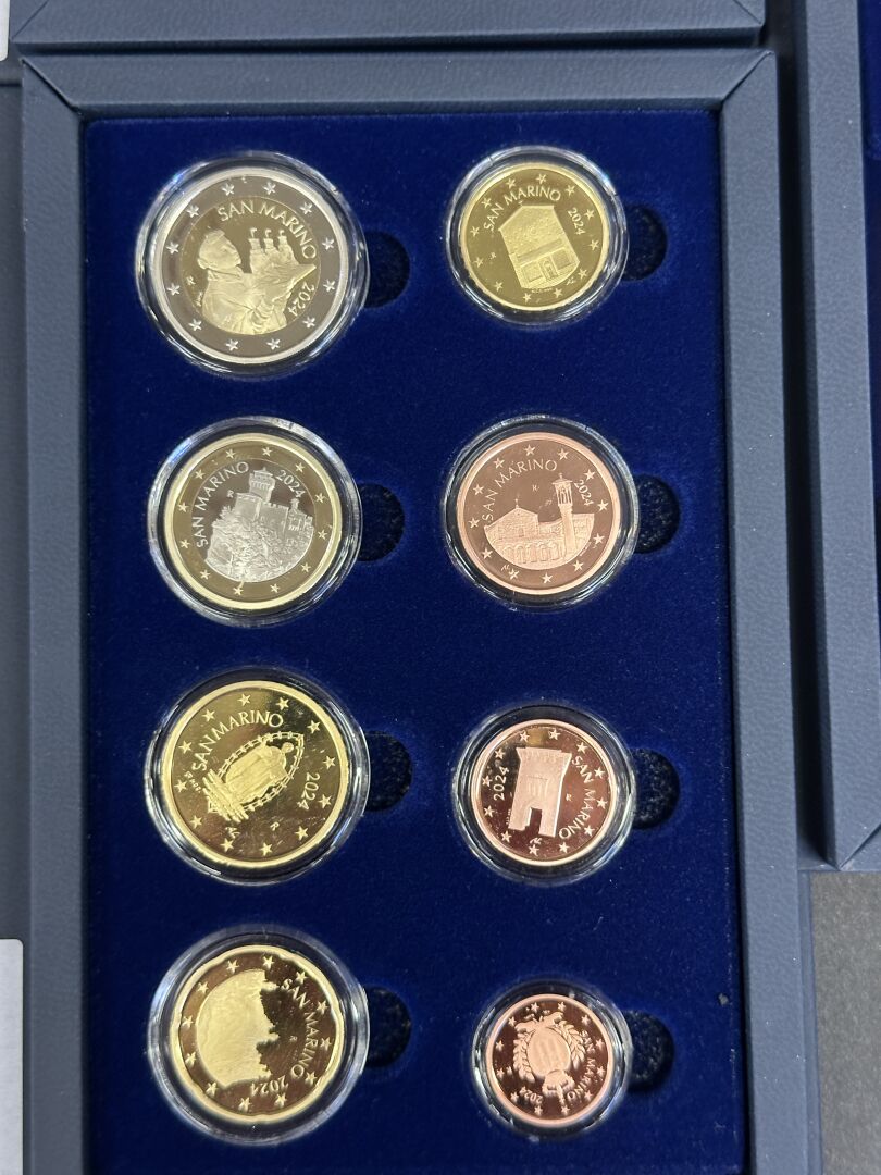 3 coffrets euro BE Saint-Marin 2024, chacun comprenant la série de l'année et les 2 pièces de 2 Euros commémoratives (l'un des coffrets n'a plus sa jaquette en carton). Expertise réalisée par le Cabinet SUFFREN NUMISMATIQUE.