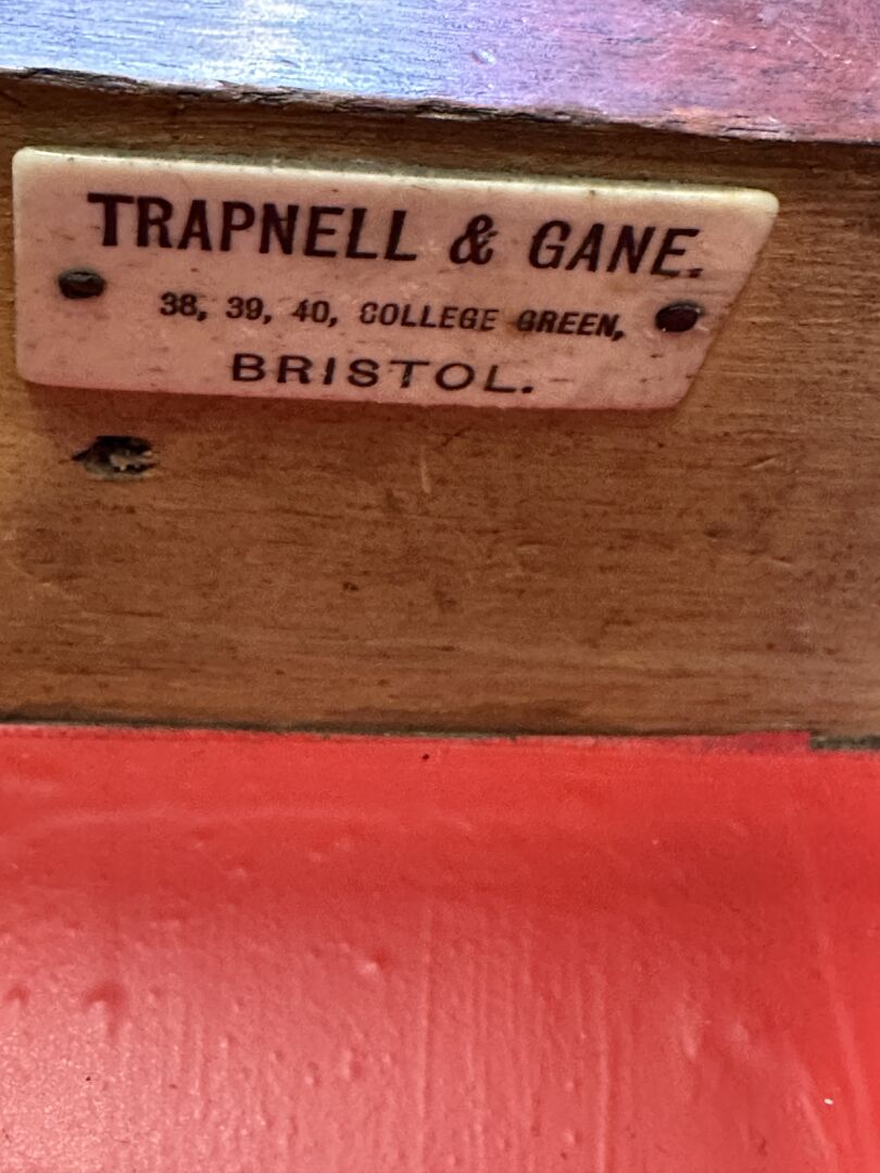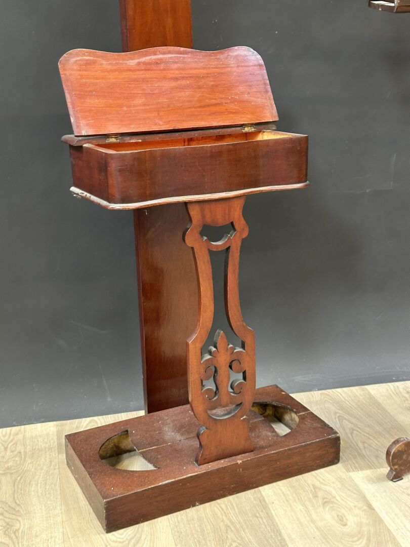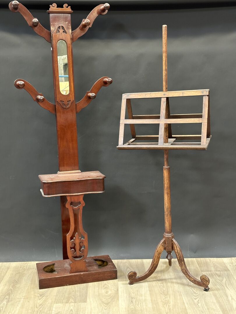 Réunion de: - vestiaire d'entrée en bois vernis, travail anglais, étiquette TRAPNELL & GANE, haut. : 185 cm; - lutrin en bois naturel, haut. : 168 cm (petits accidents, état d'usage). XXe siècle.