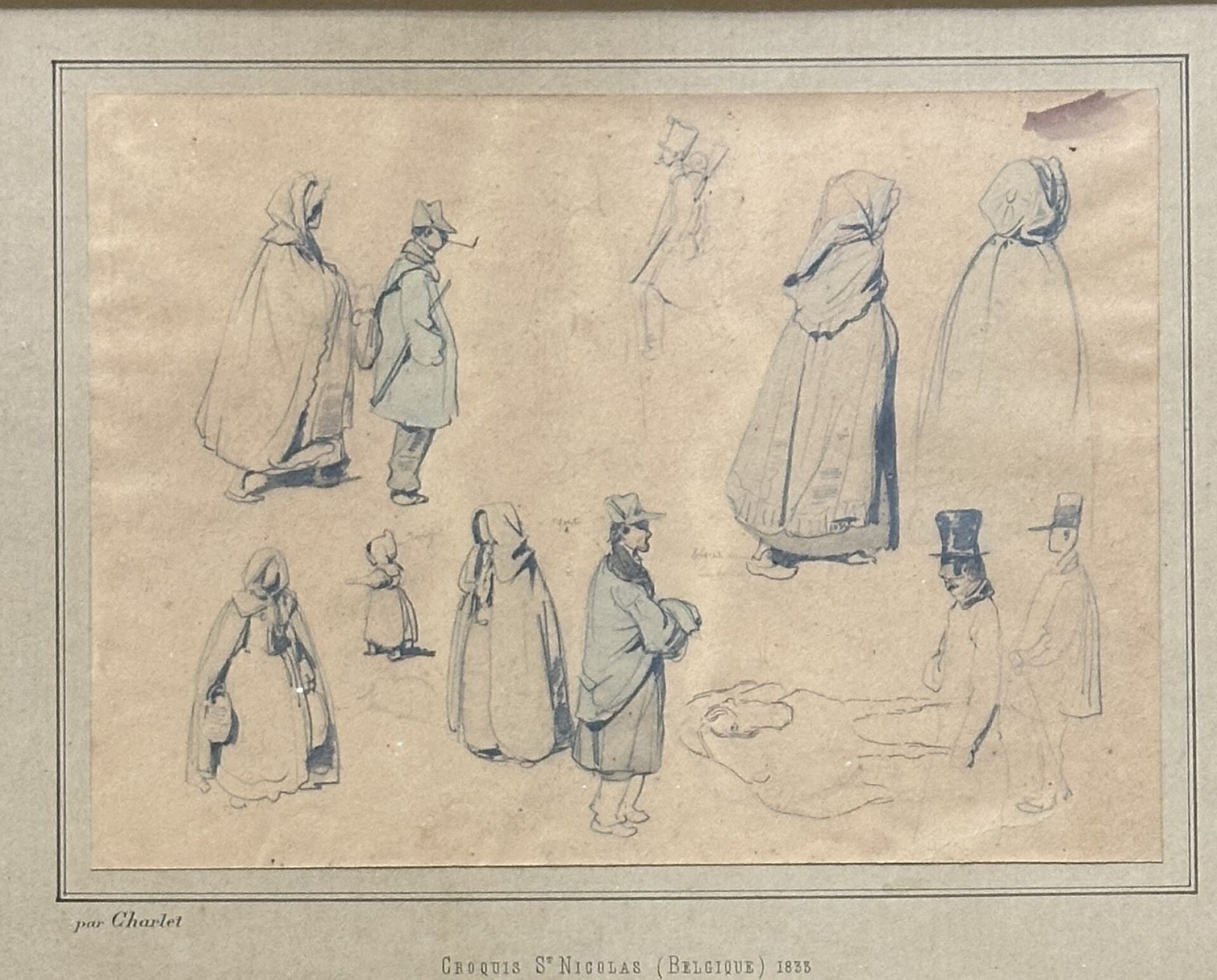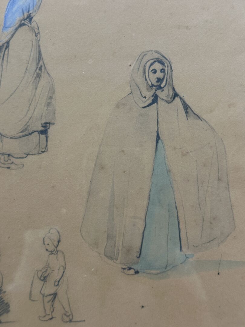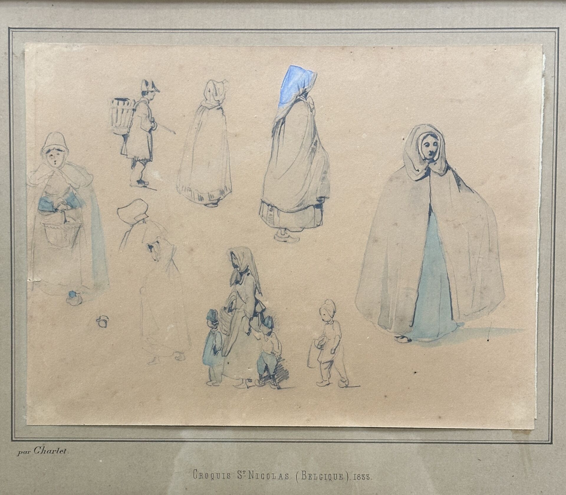 Suite de deux feuilles de croquis de personnages, l'une avec annotation de couleurs (petits accidents et taches). L'encadrement mentionne "Par CHARLET - Croquis Saint Nicolas (Belgique) 1833". Haut. : 23 cm - Larg. : 31,5 cm