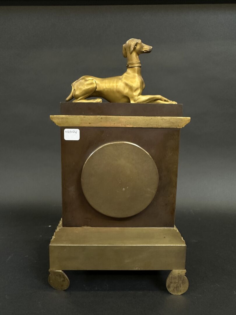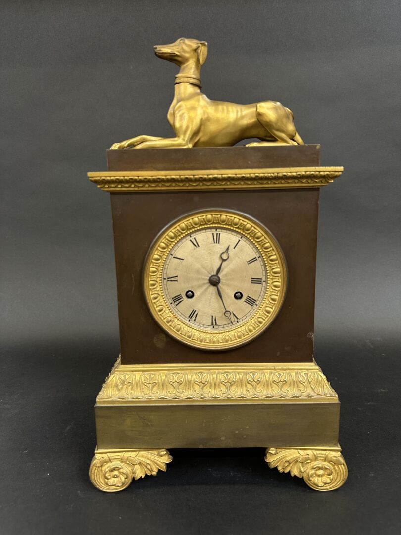 Pendule borne en métal et bronze à patine brune et dorée surmontée d'un lévrier couché. Cadran à chiffres romains, lunette à frise d'oves, repose sur quatre pieds en volutes feuillagées (un pied tordu). Milieu du XIXe siècle. Haut. : 40 cm - Larg. : 23 cm - Prof. : 11,5 cm