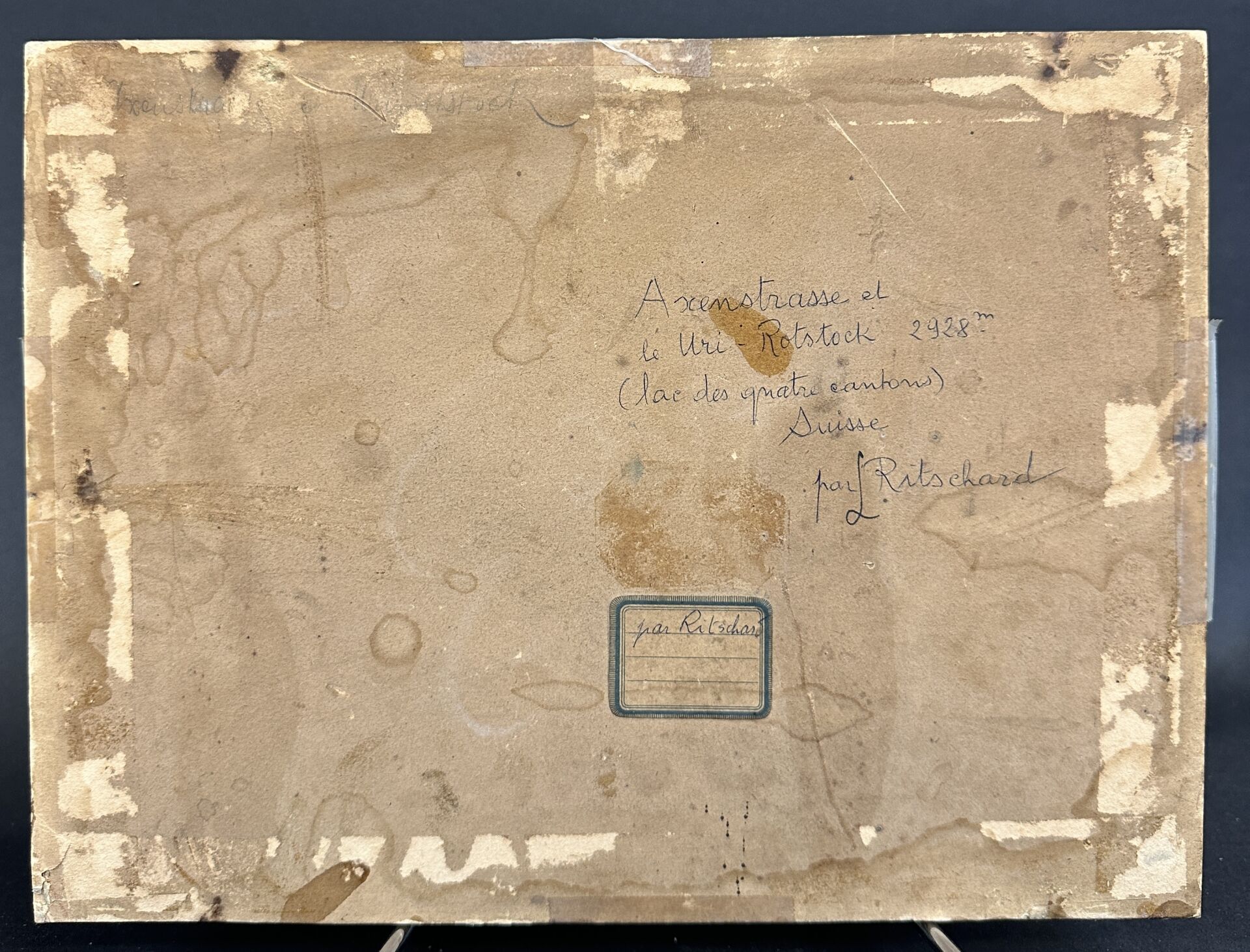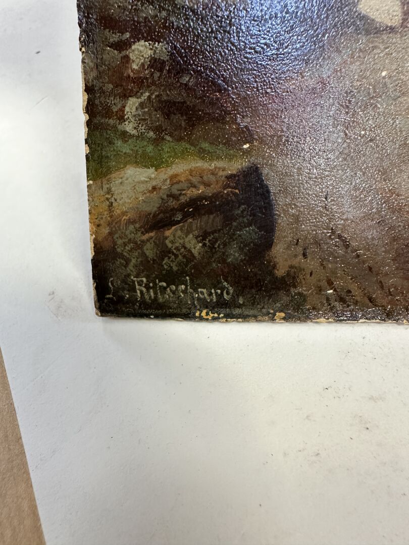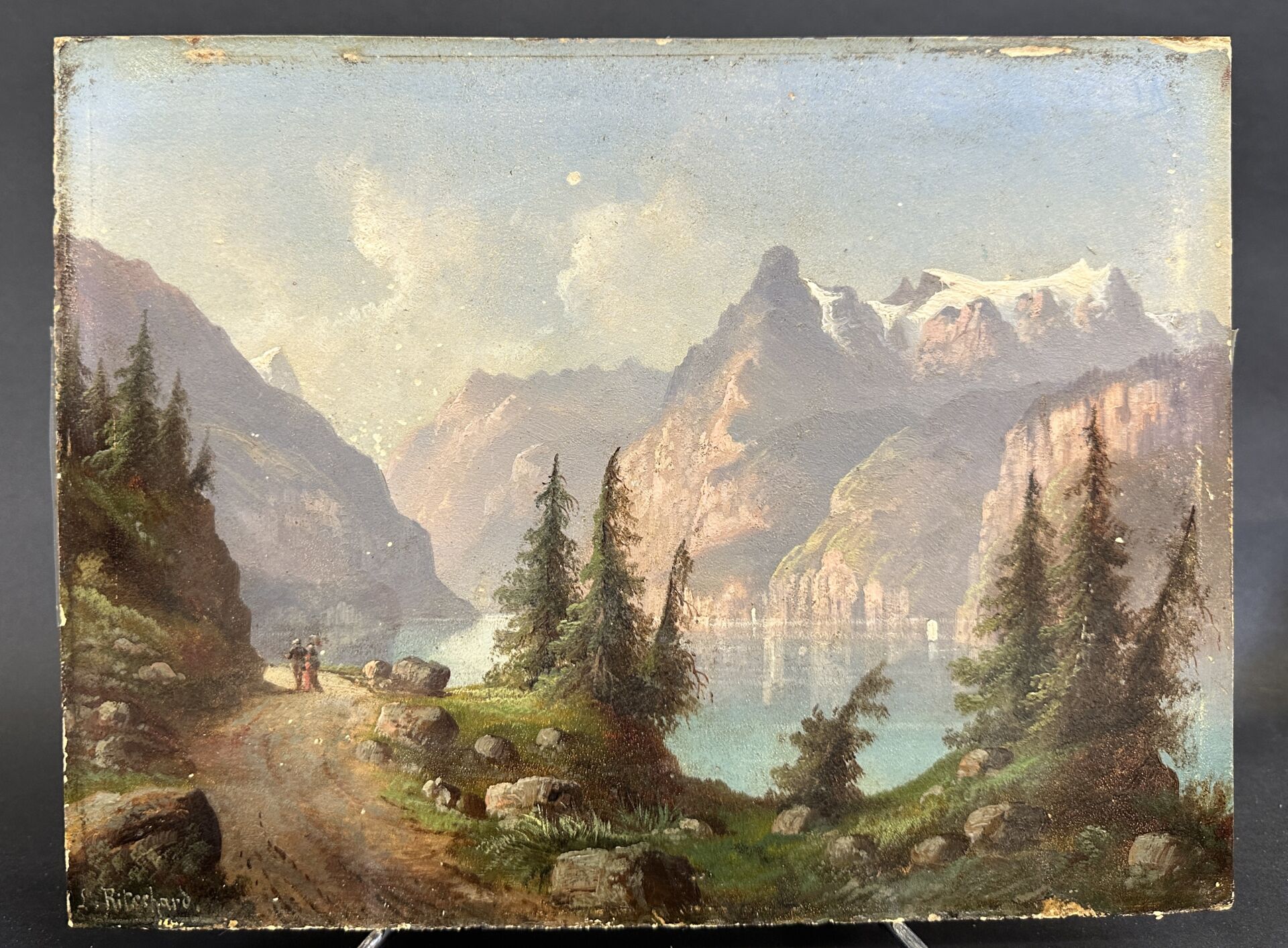 Hubert SATTLER dit L. RITSCHARD (1817-1904). "Axenstrasse et le Uri-Rotstock 2928m (Lac des quatre cantons) Suisse" Huile sur carton signée en bas à gauche, annotée au dos (manques). Haut. : 22 cm - Larg. : 29 cm