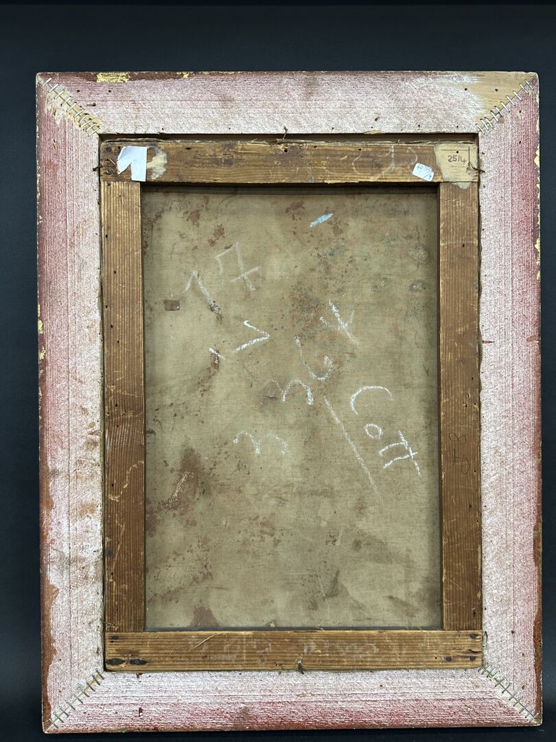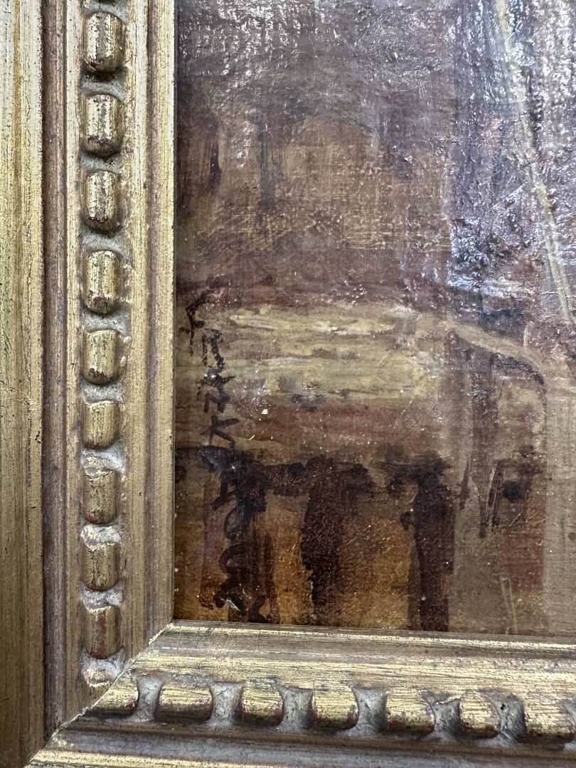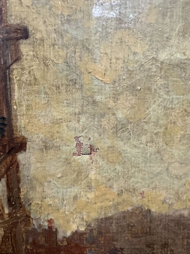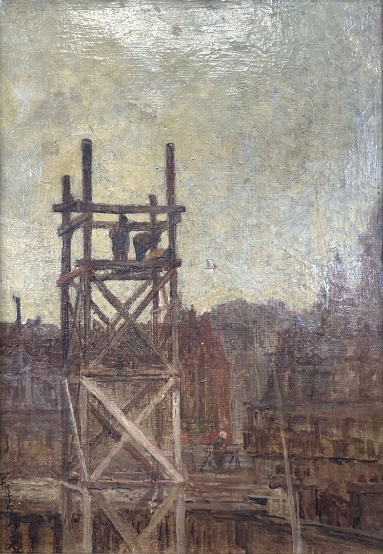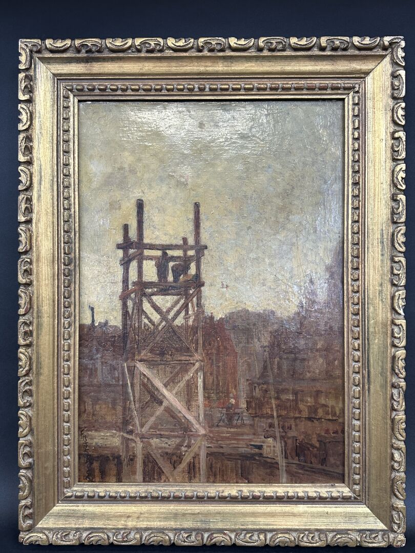 Frank Myers BOGGS (1855-1926) "Construction des immeubles du boulevard Delessert" Huile sur toile signée à la verticale en bas à gauche, titrée au dos (accident). Haut. : 46 cm - Larg. : 33 cm