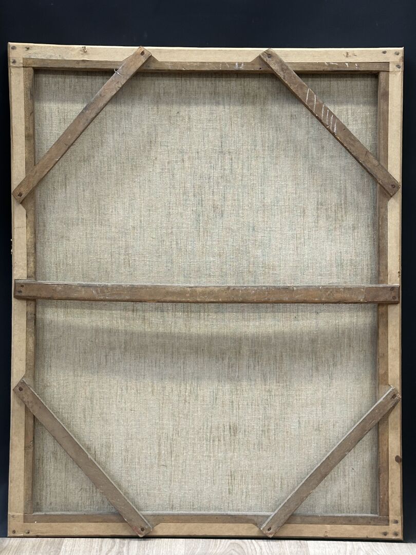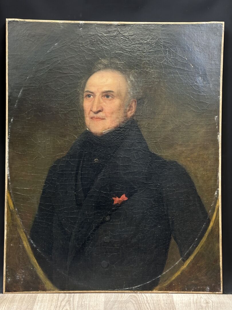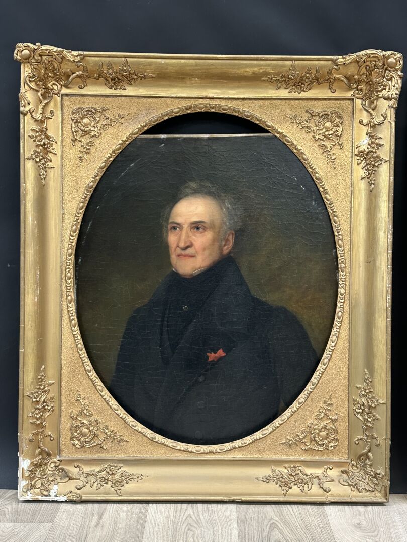Ecole française du XIXe siècle. Portrait d'homme en noir. Huile sur toile, dans un cadre à vue ovale (rentoilé, usures et manques). Haut. : 81,5 cm - Larg. : 66 cm