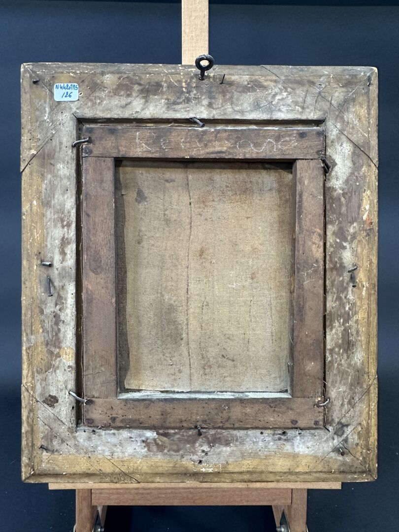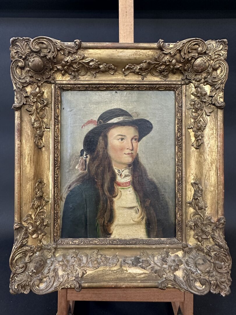 Ecole bretonne fin du XIX-début du XXe siècle. Portrait de Jeune breton en costume traditionnel. Huile sur toile (rentoilée). Haut. : 27 cm - Larg. : 21.5 cm Cadre en bois et stuc doré, mouluré et sculpté