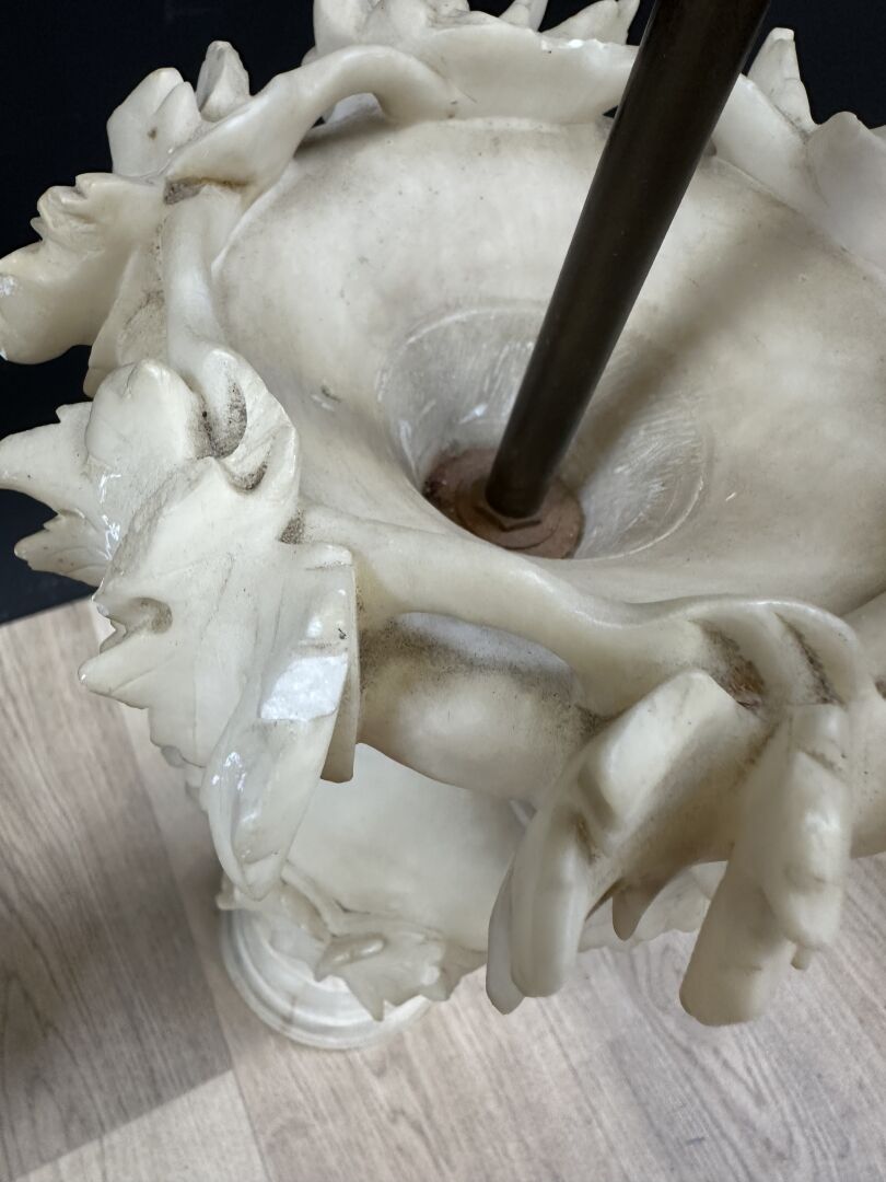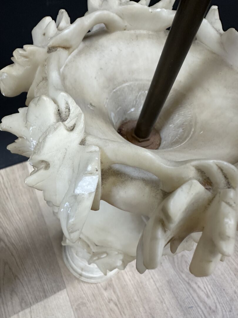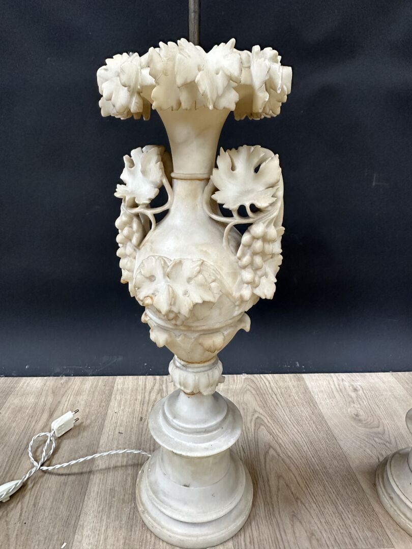 Paire d'urnes en albâtre à décor de pampres de vignes et grappes de raisins, montées en lampe (accidents, restaurations, manques). Travail probablement italien, XXe siècle. Haut. : 55 cm