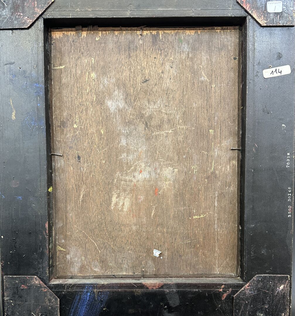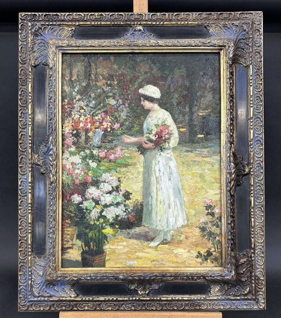 Ecole française du XXe siècle. Femme cueillant des fleurs. Huile sur panneau signée en bas au milieu MARTINS (?). Haut. : 38,5 cm - Larg. : 30 cm