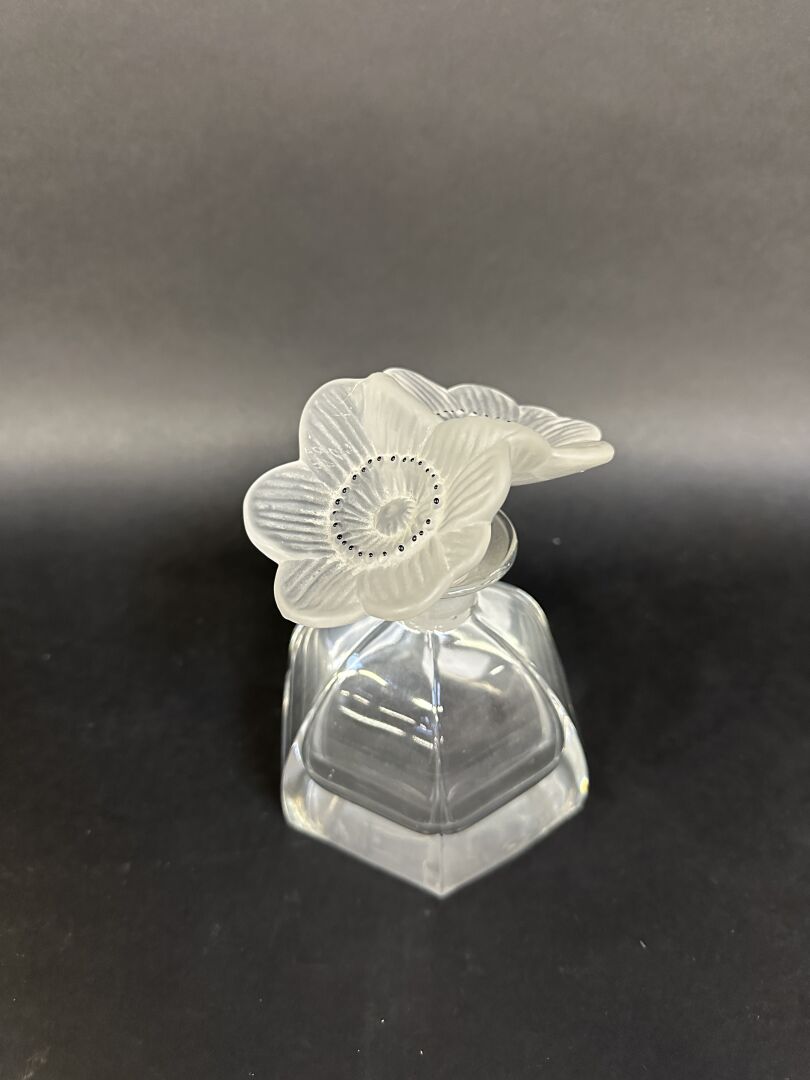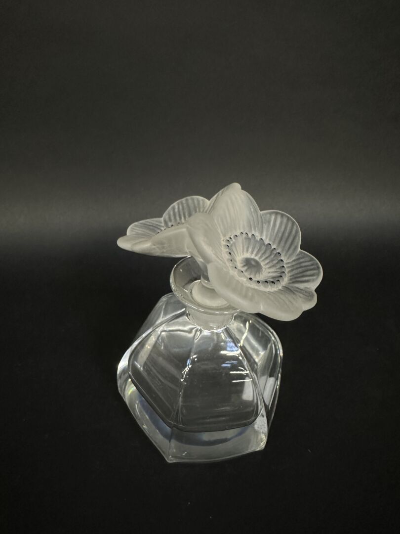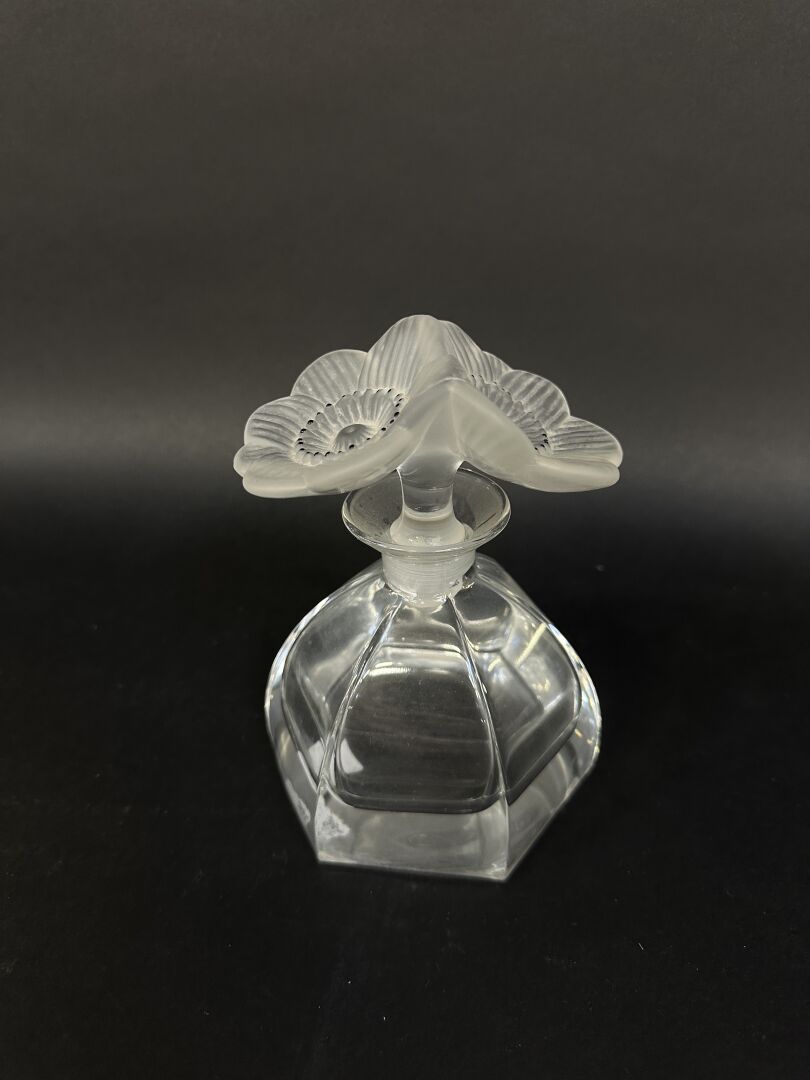 Dans le goût de LALIQUE. Flacon en verre à six pans, avec bouchon en verre blanc moulé-pressé satiné et émaillé figurant deux anémones ouvertes (rares éclats). Haut. : 15 cm