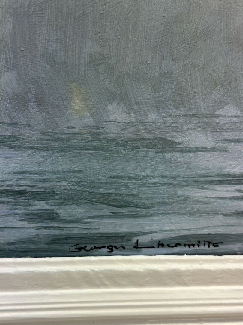 Georges LHERMITTE (1882-1967). Bateaux de pêche. Huile sur isorel signée en bas à droite (accident et manques en haut à gauche). Haut. : 55 cm - Larg. : 100 cm