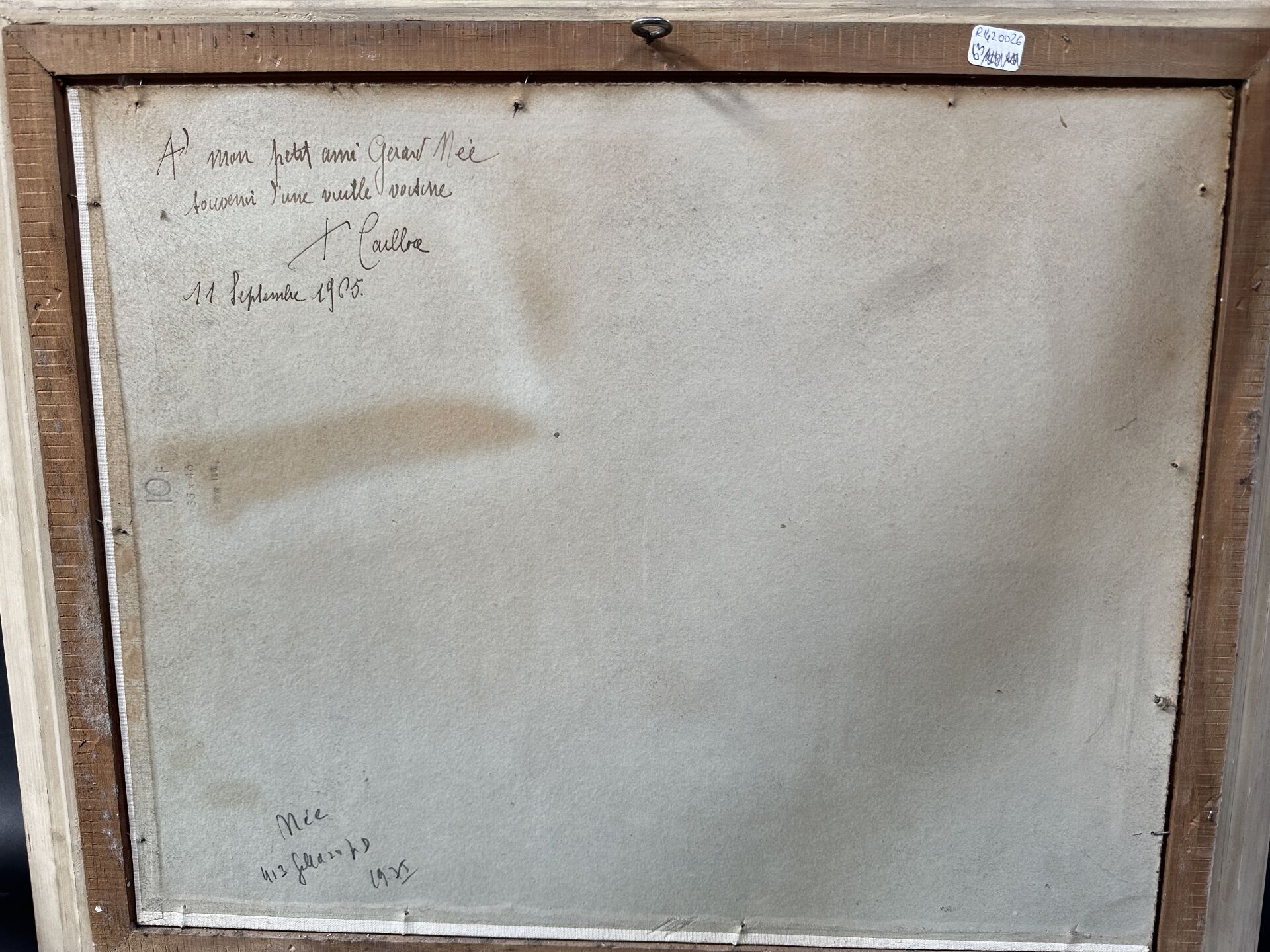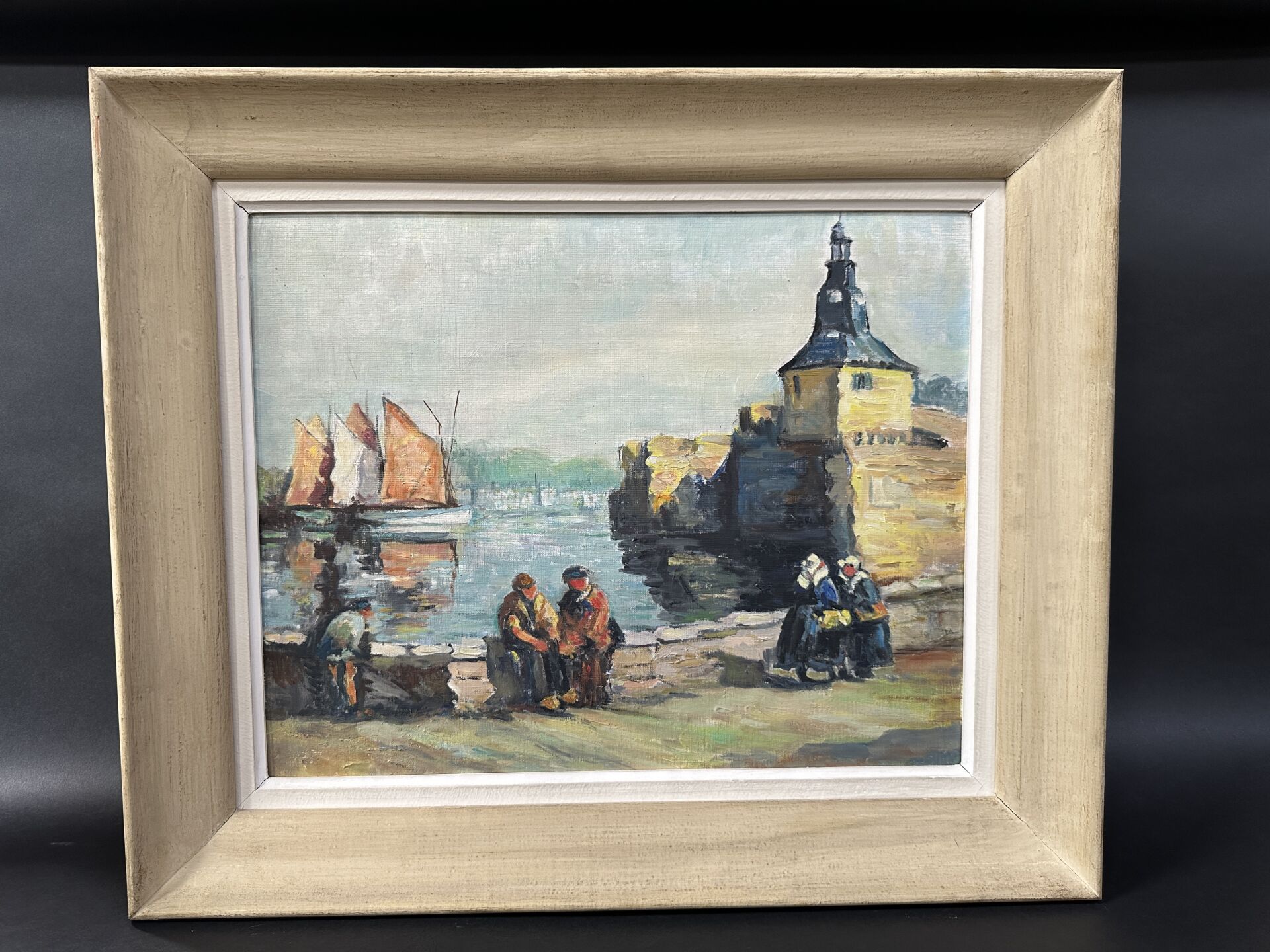F.CAILLOCE (XXe siècle). Vue de la ville close de Concarneau. Huile sur toile contre-collée sur panneau, dédicacée au dos : "A mon petit ami Gérard Née, souvenir d'une vieille voisine" avec signature et datée 11 septembre 1954. Haut. : 40 cm - Larg. : 50 cm