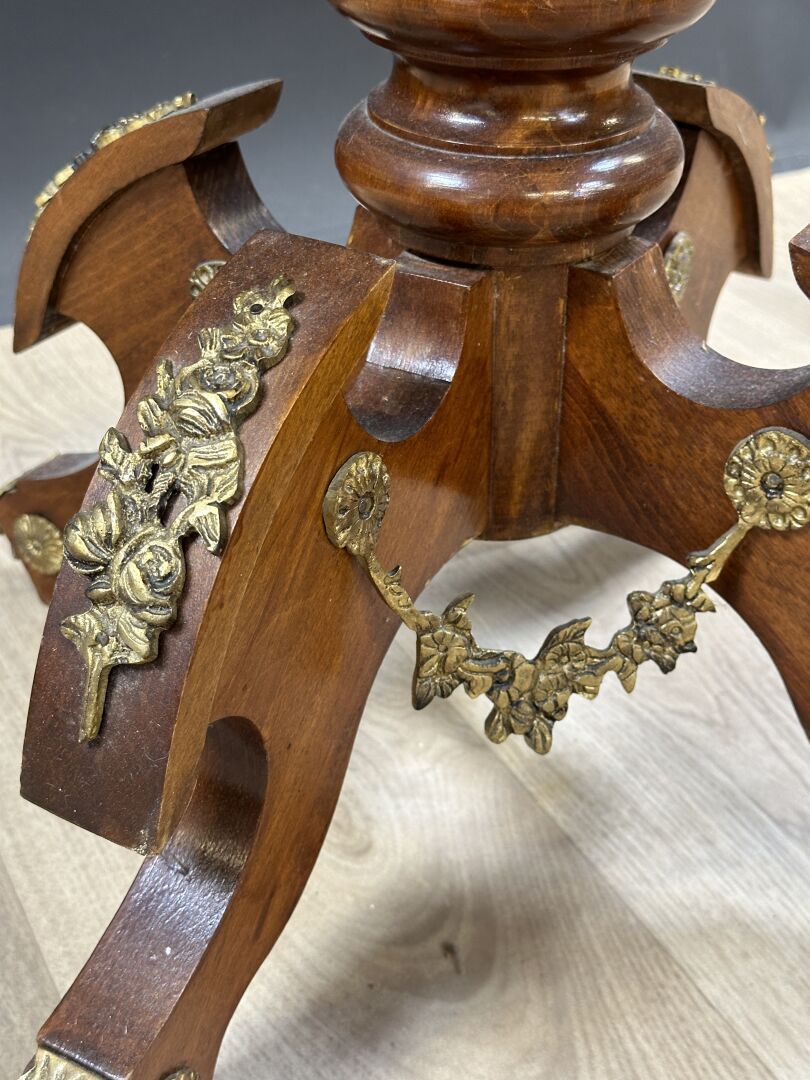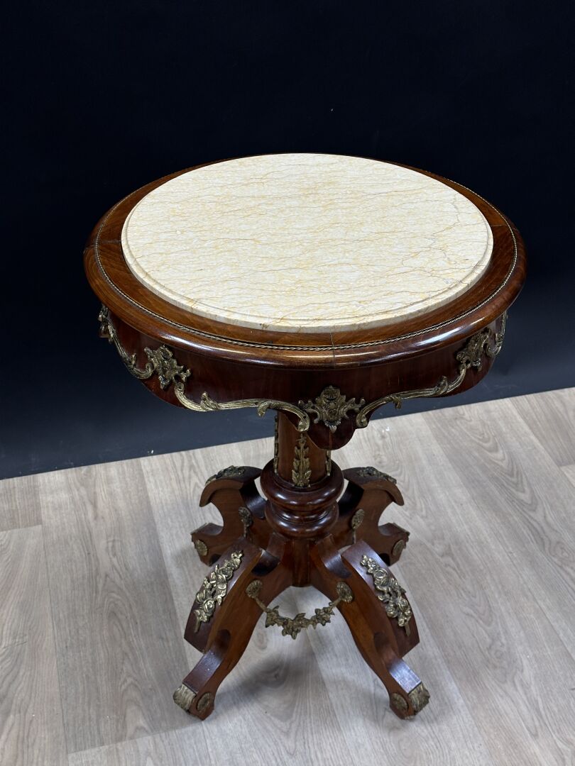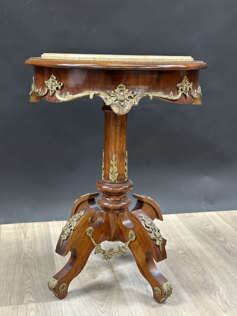 Guéridon rond en bois verni, piètement quadripode, riche ornementation en laiton doré, plateau de marbre jaune veiné. Style baroque, XXe siècle. Haut. : 74 cm - Diam. : 56 cm