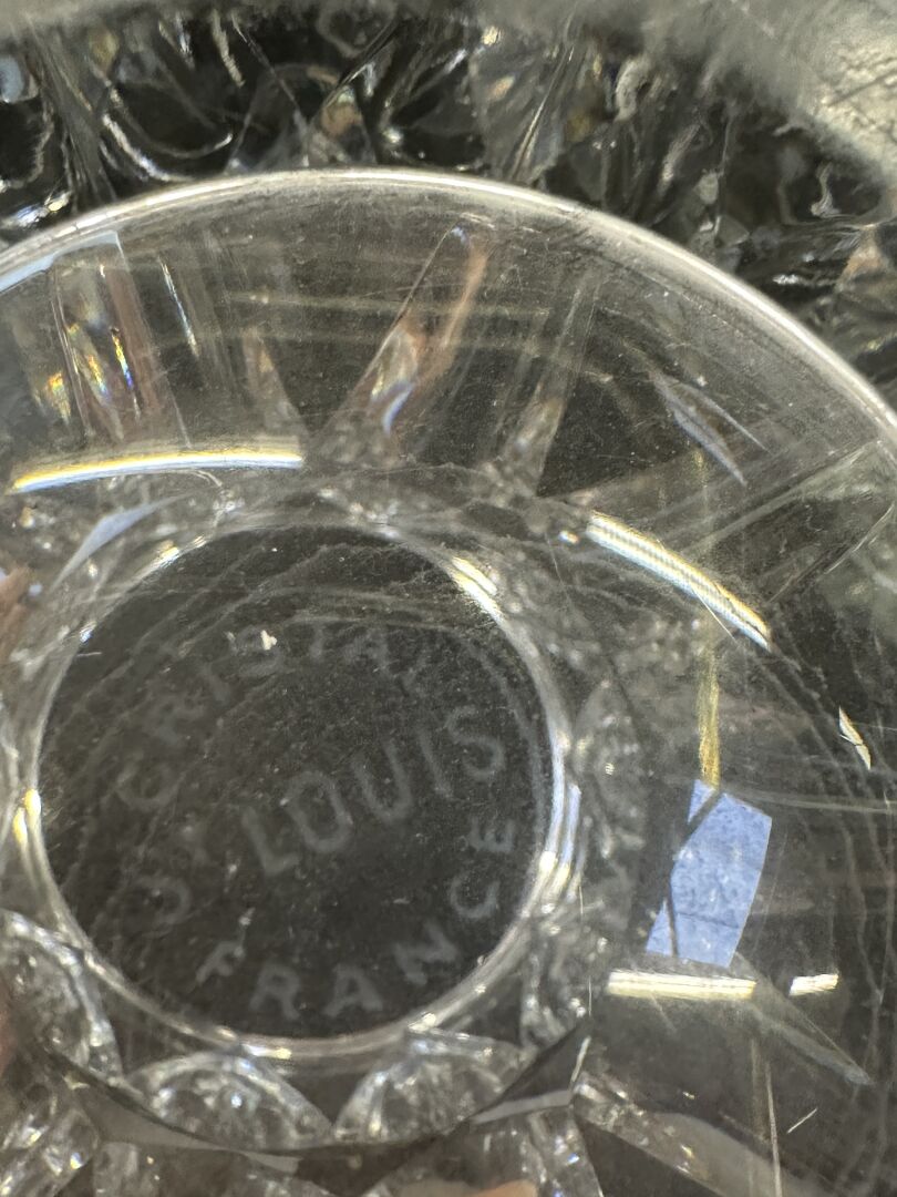 Réunion de cinq vases et coupes en cristal taillé ou verre dont un vase Cristallerie SAINT LOUIS (éclats). Haut. : de 14,5 à 30 cm