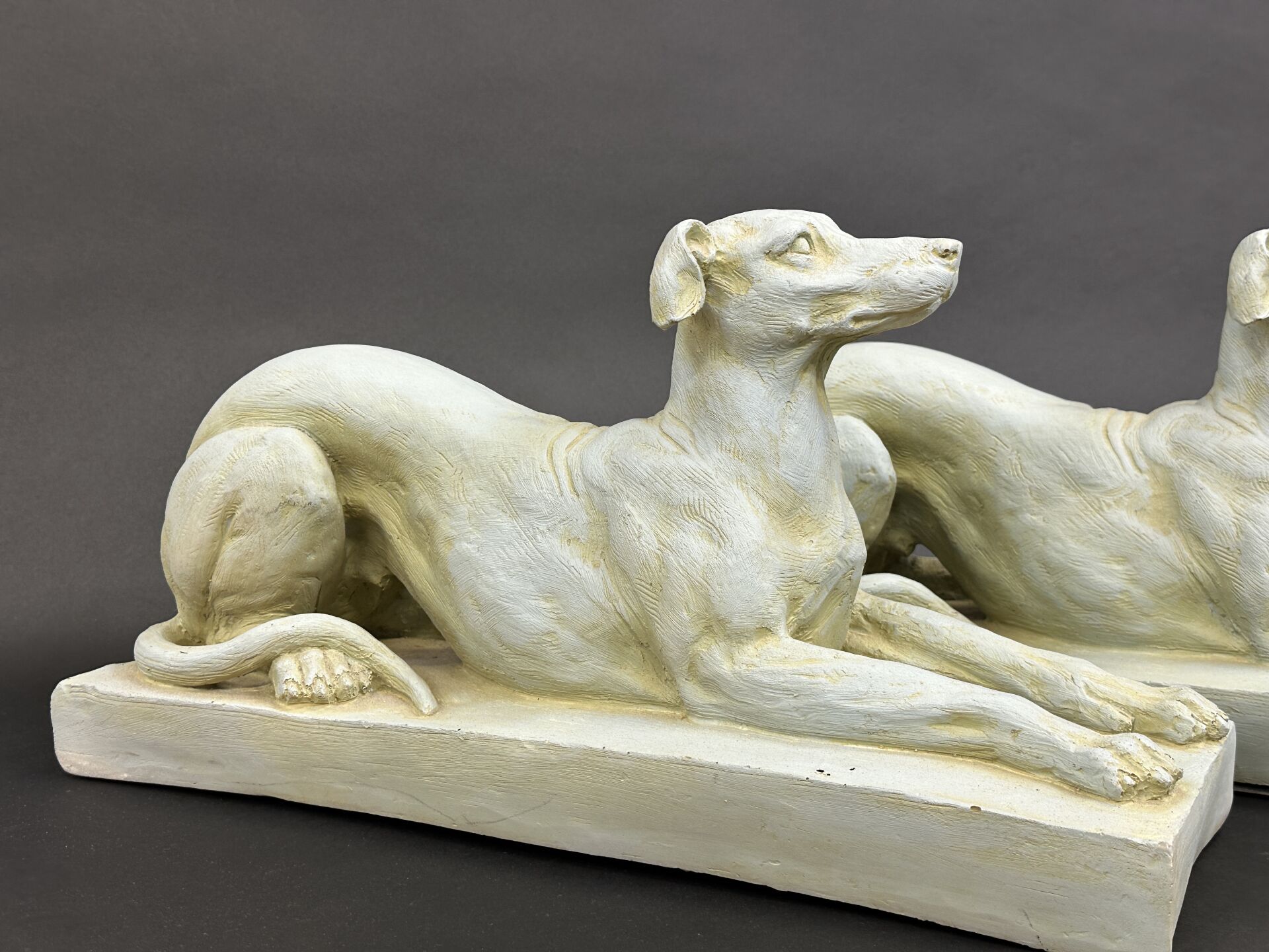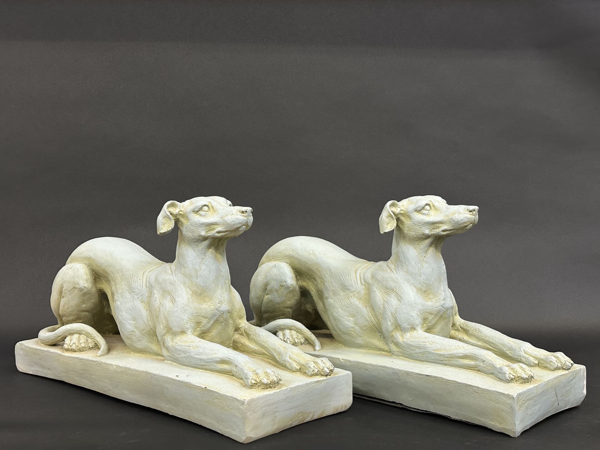 Paire de lévriers couchés en plâtre (petits manques). XXe siècle. Haut. : 25 cm - Larg. : 47 cm - Prof. : 17 cm