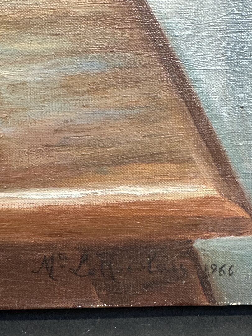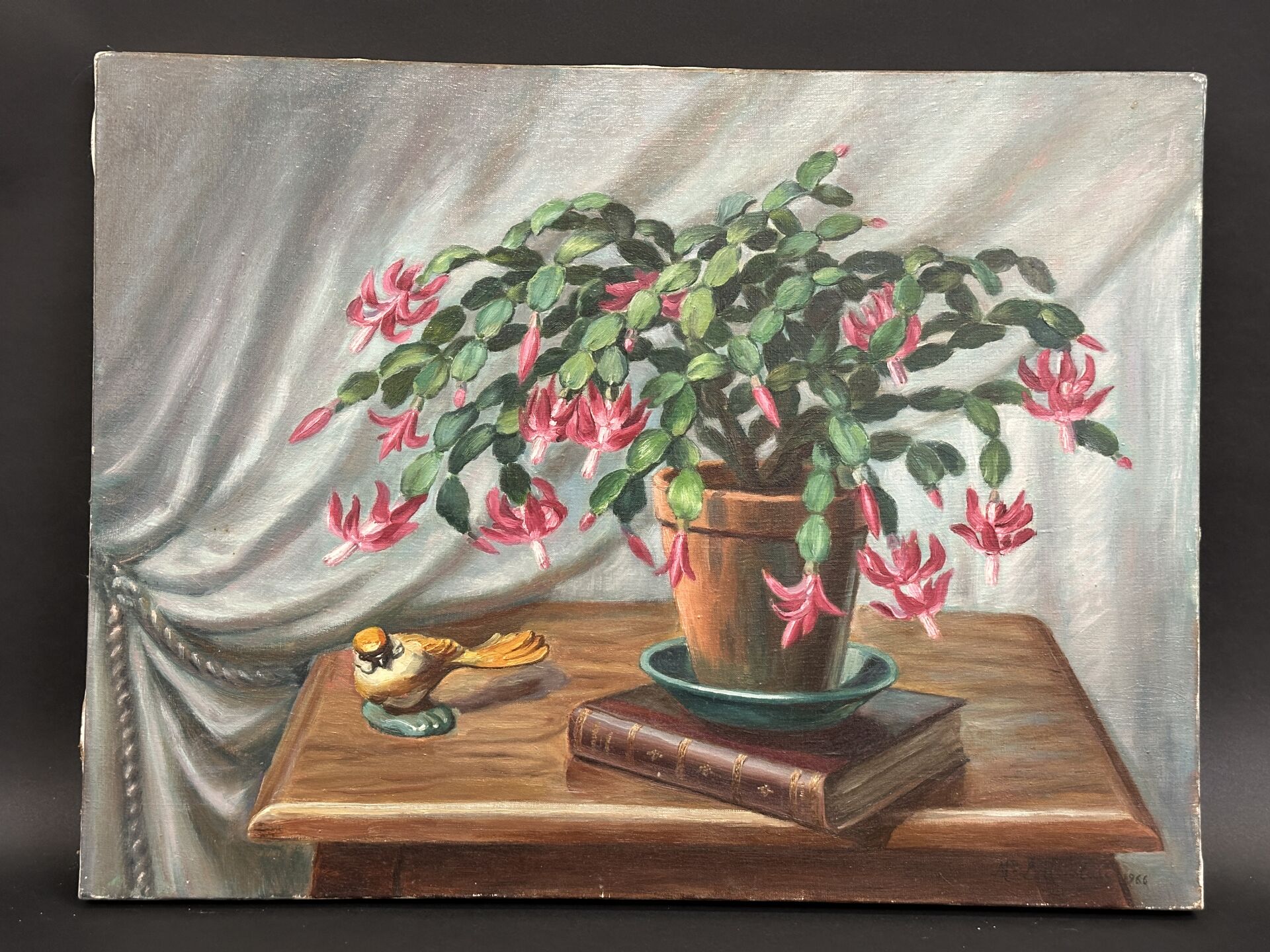 Marguerite LE RICOLAIS (1895-1981). Cactus de Noël au moineau. Huile sur toile signée en bas à droite et datée 1966. Haut. : 41 cm - Larg. : 54 cm