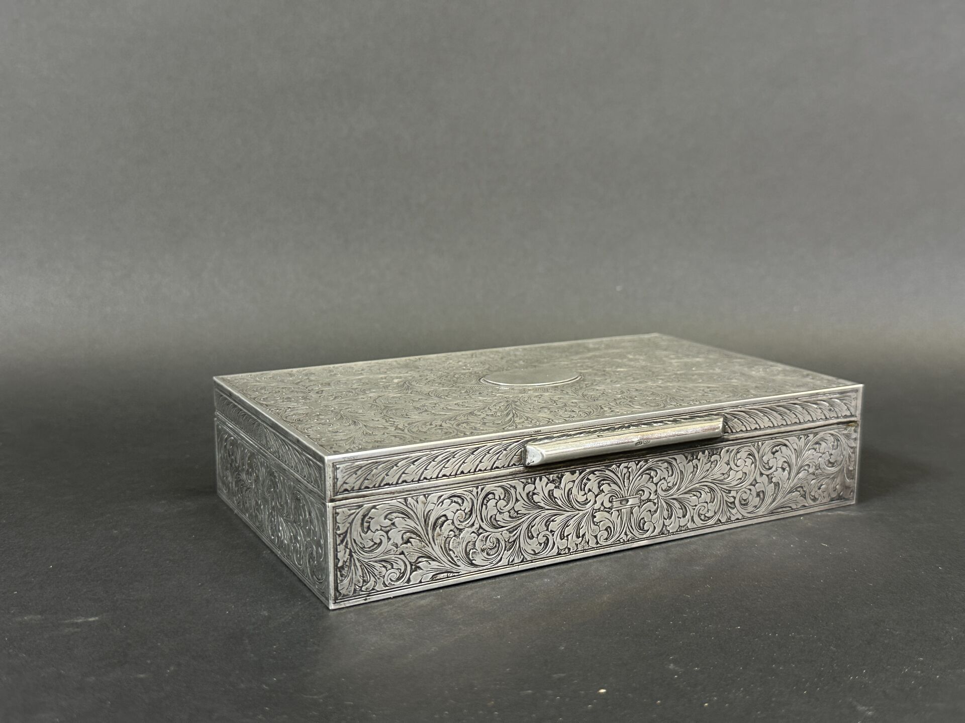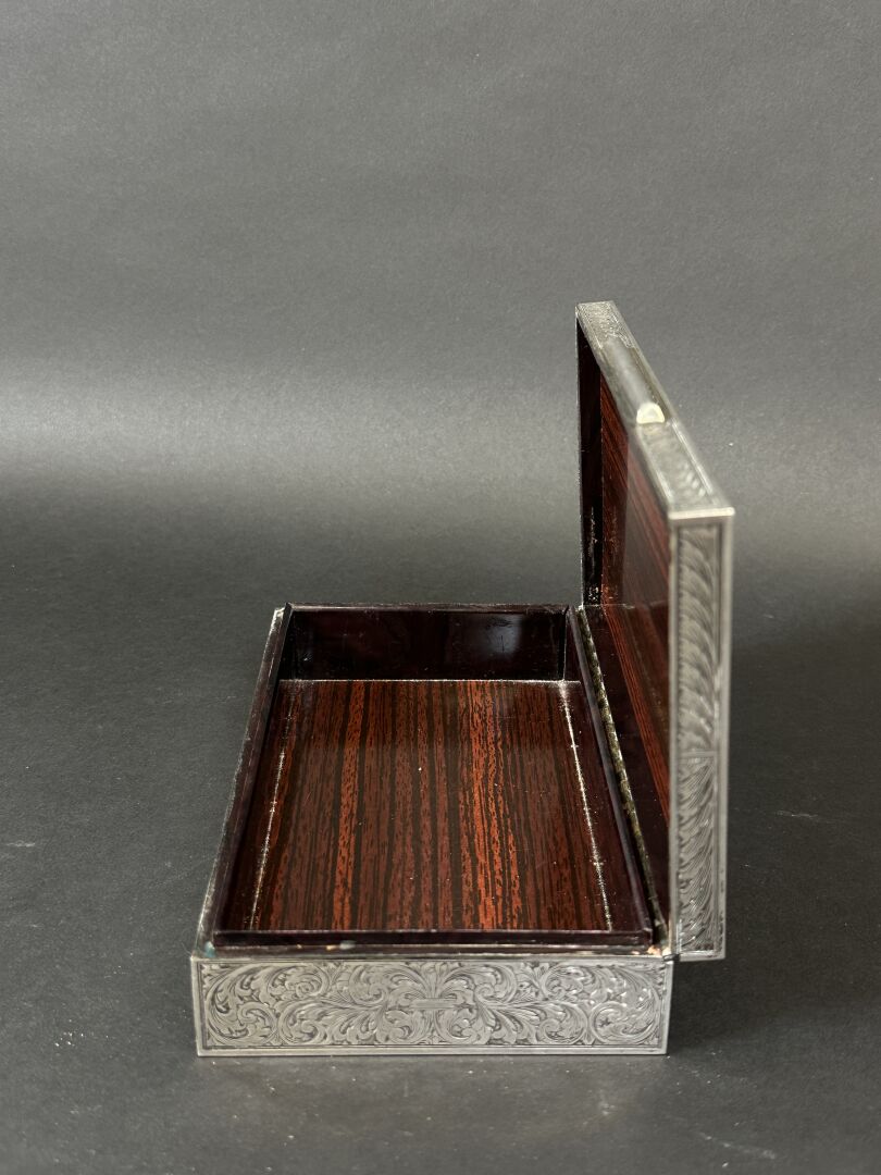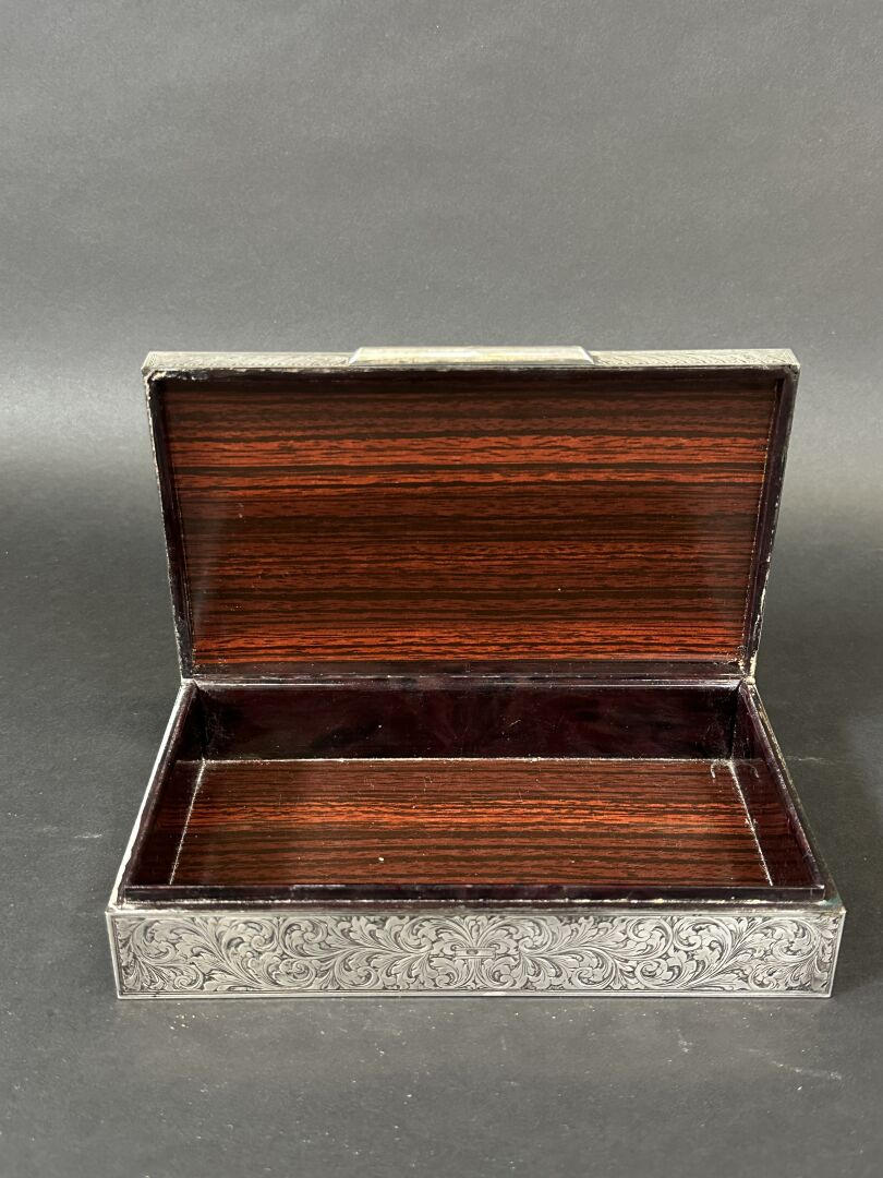 Boîte à cigarettes rectangulaire, l'âme en bois, parée d'argent 800 millièmes à décor de rinceaux feuillagés. Travail étranger du XXe siècle. Poids brut : 337 g - Haut. : 4 cm - Larg. : 18 cm - Prof. : 11 cm