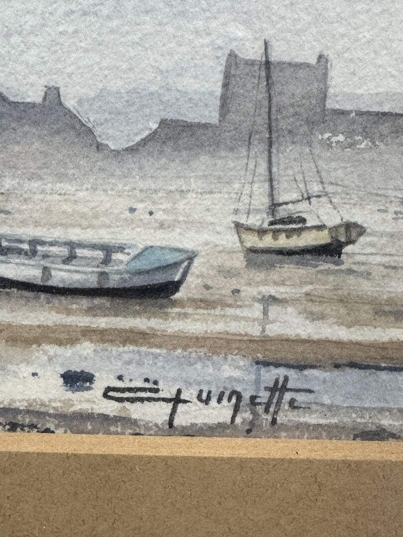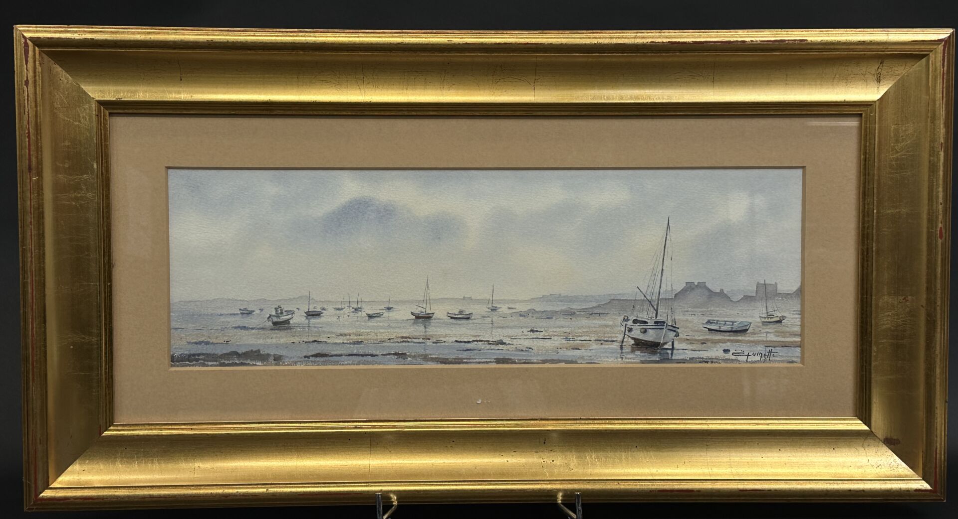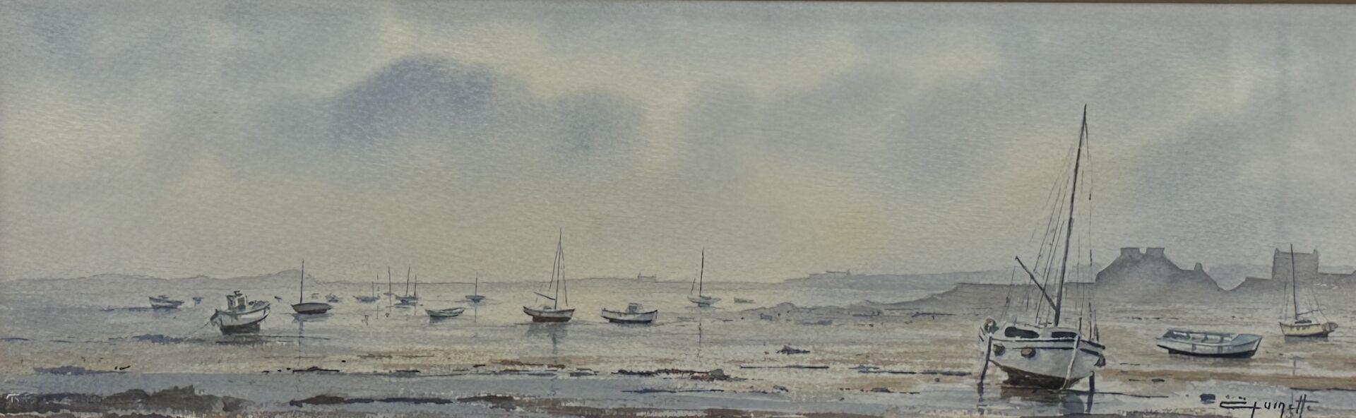 Jean-Claude QUINETTE (né en 1956). La baie à marée basse. Aquarelle signée en bas à droite. Dim. à vue : Haut. : 17 cm - Larg. : 53 cm